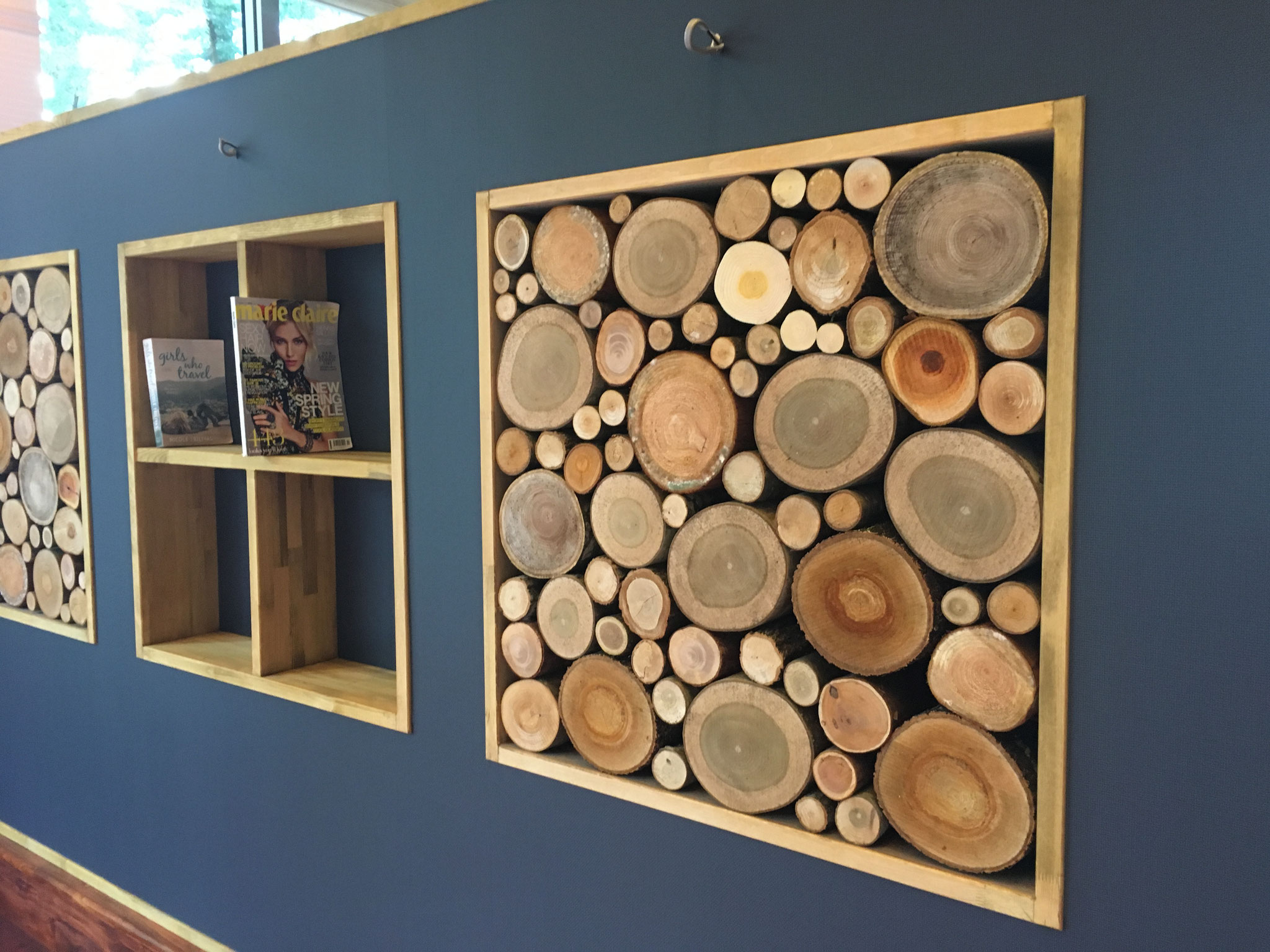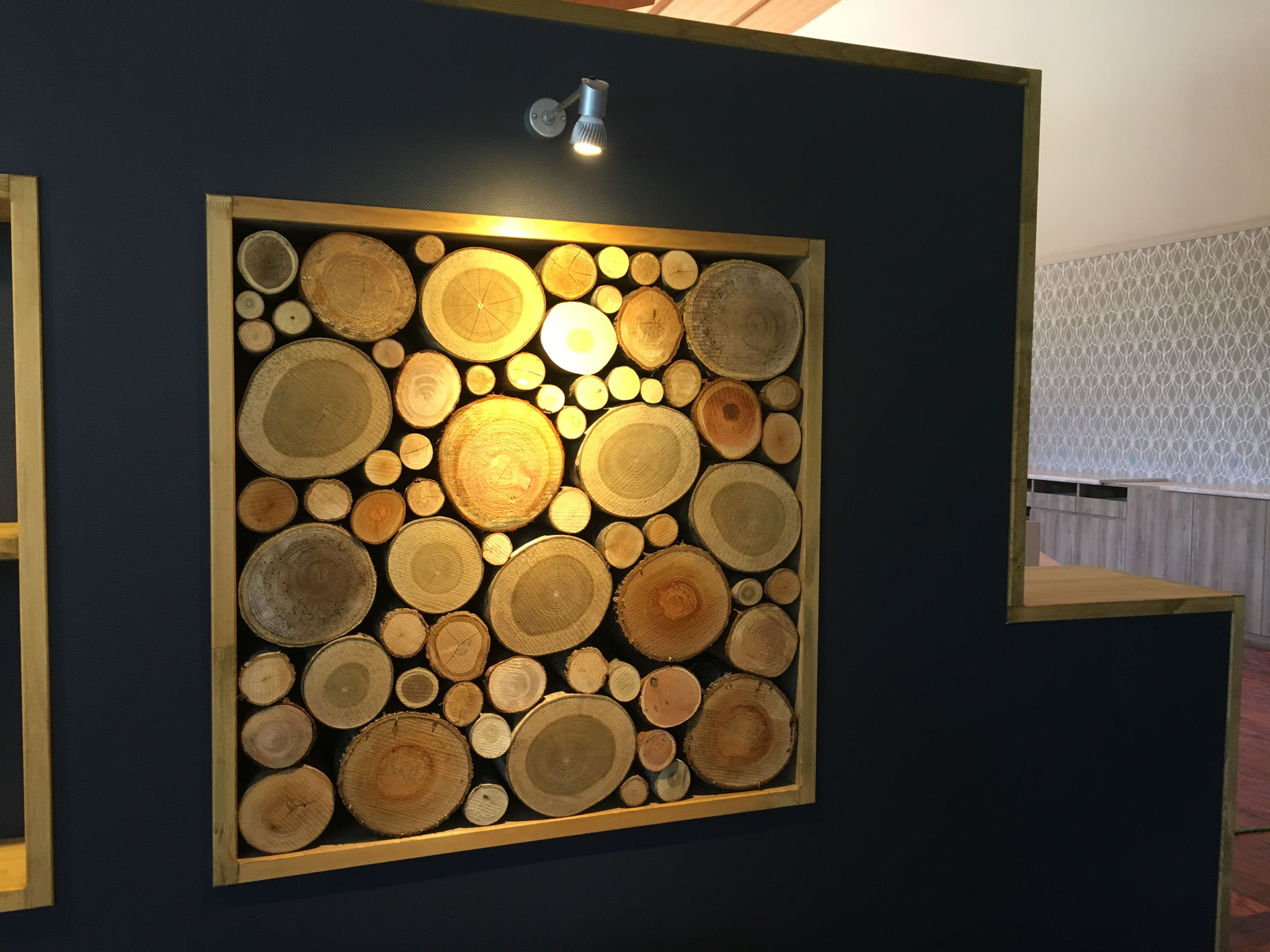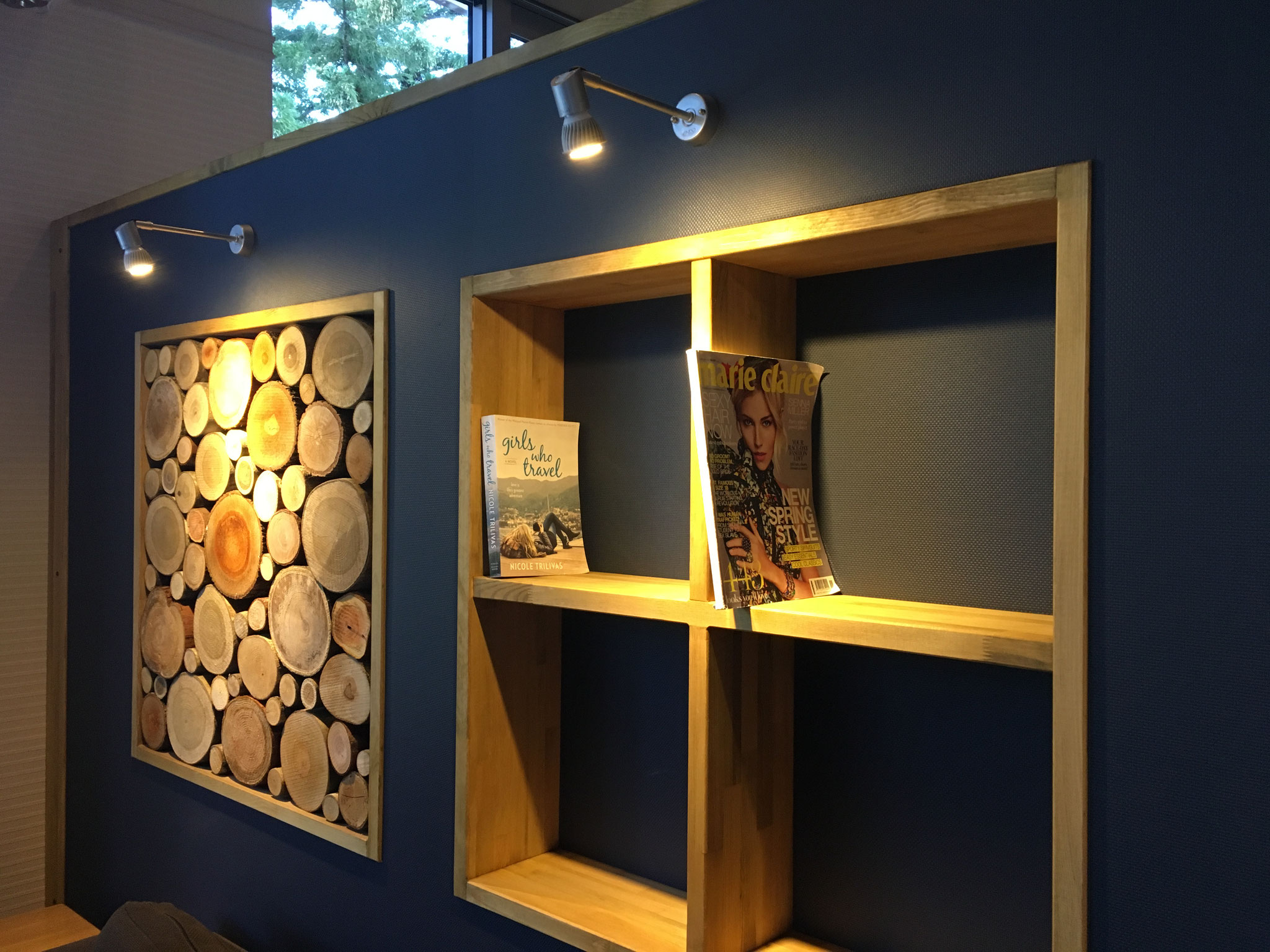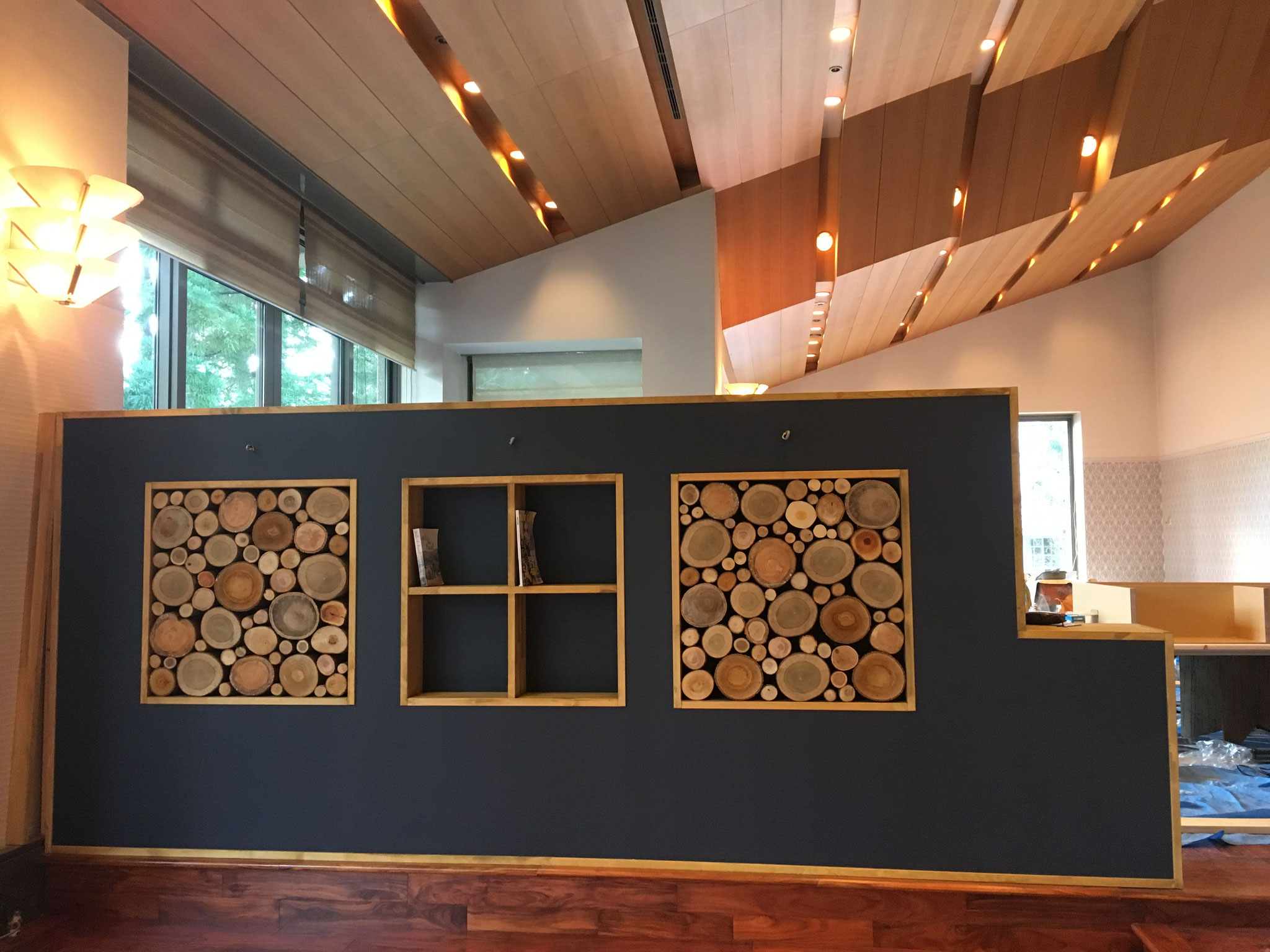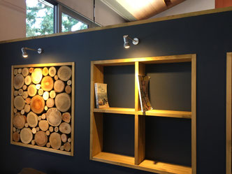 木の丸太を20CMにカットしたものをパーテーションのアクセントにしました。ネイビーブルーの部分は、ビニールクロスです。本や置物が飾れるよう棚を作りました。照明も効果的!!
