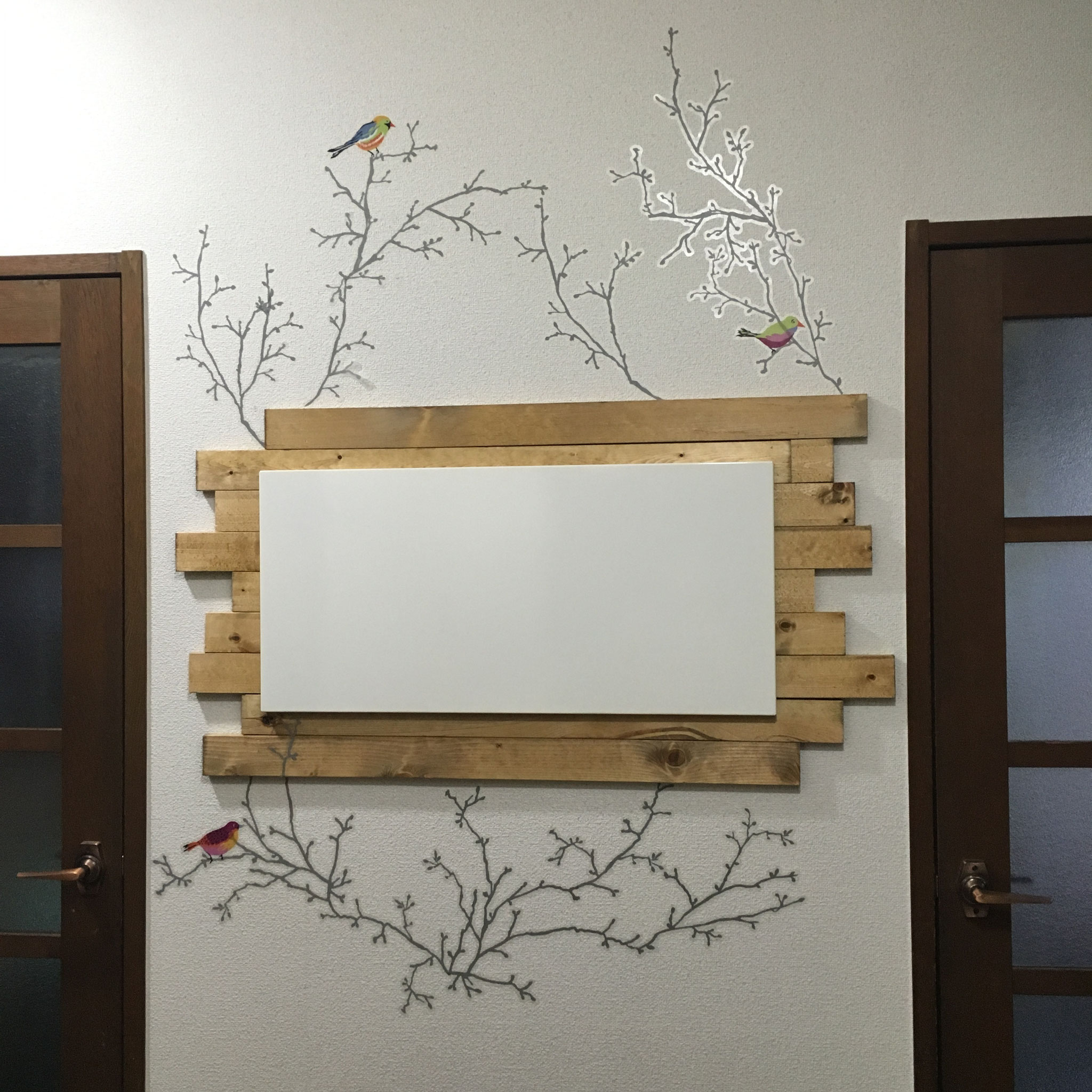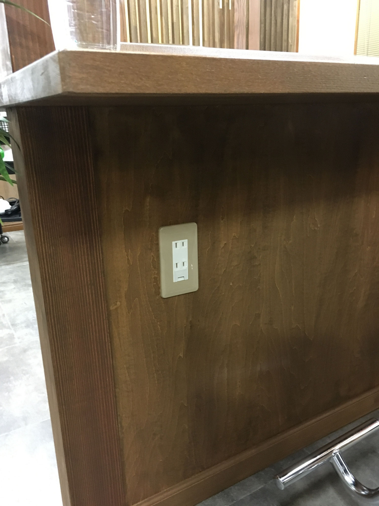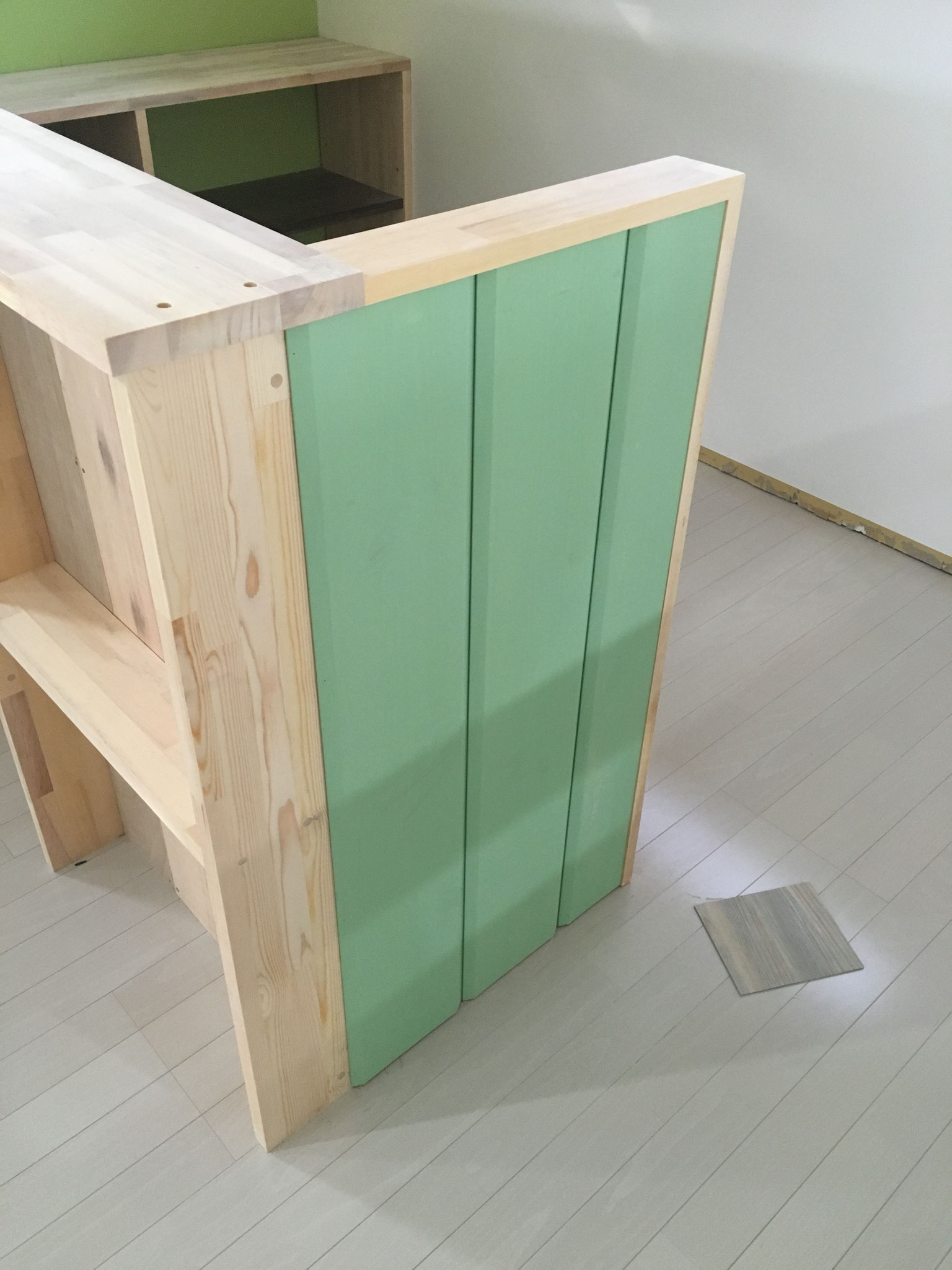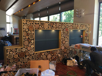 木の丸太を20CMにカットしたものをパーテーションのアクセントにしました。ネイビーブルーの部分は、ビニールクロスです。本や置物が飾れるよう棚を作りました。照明も効果的!!