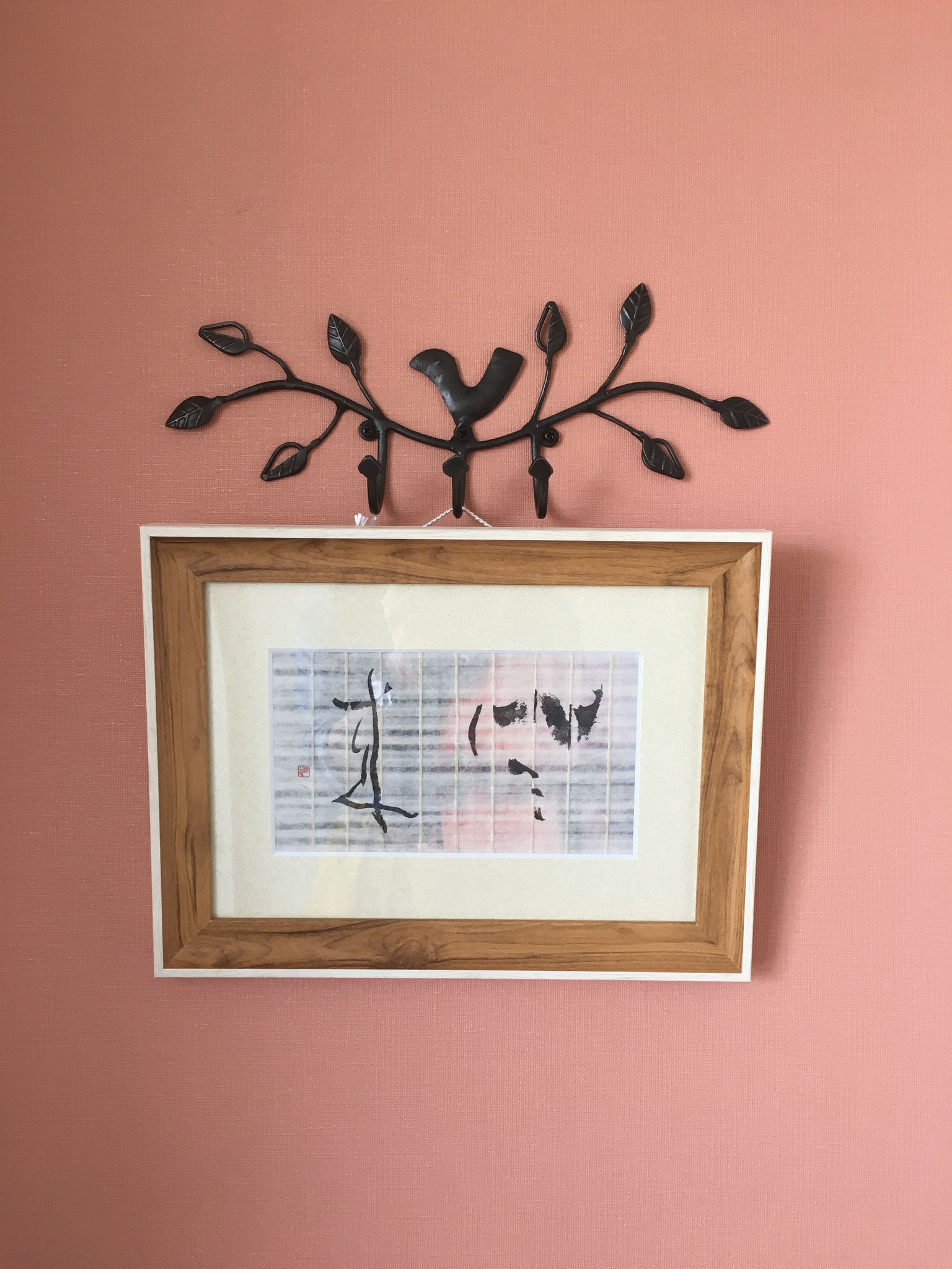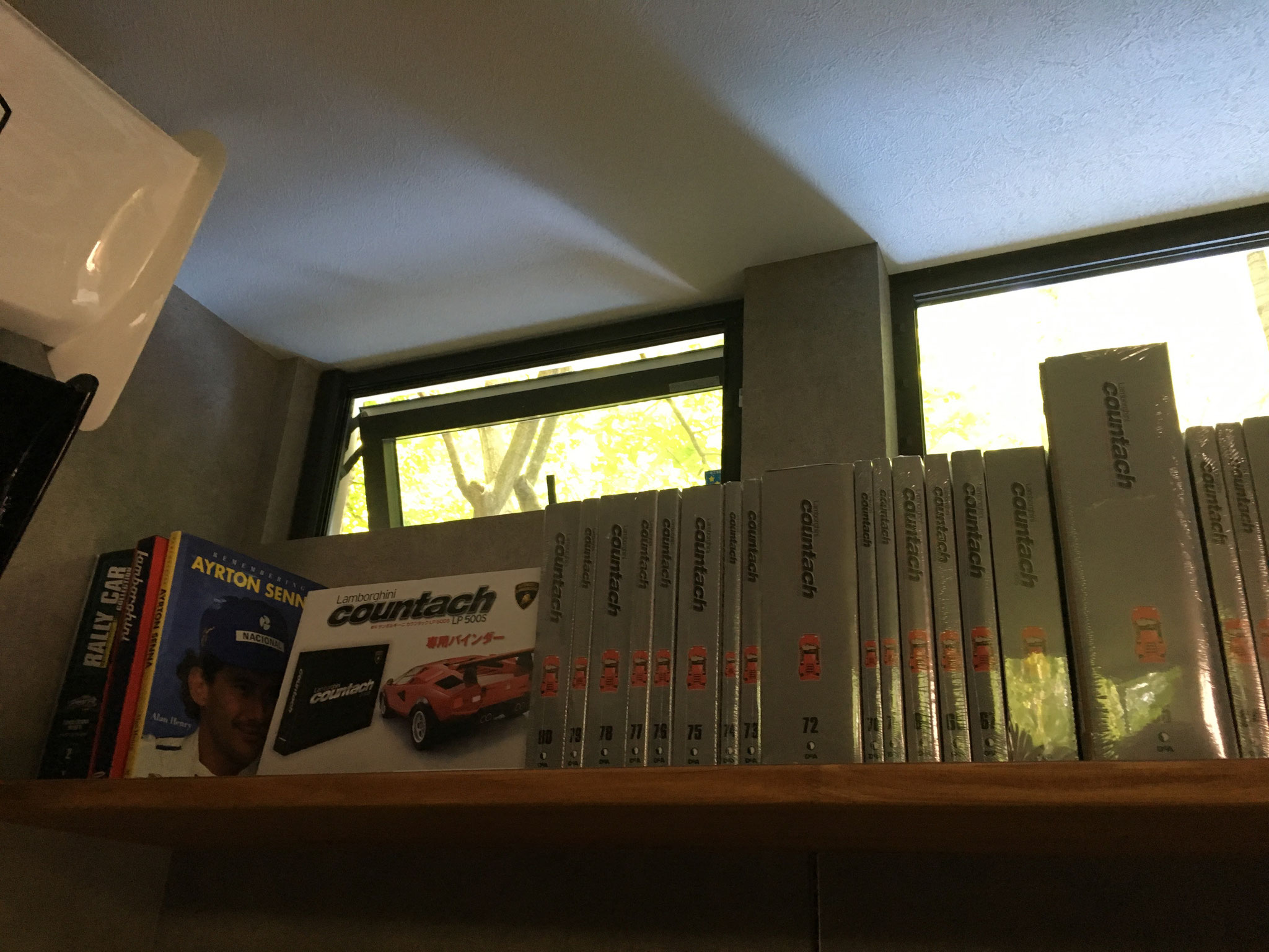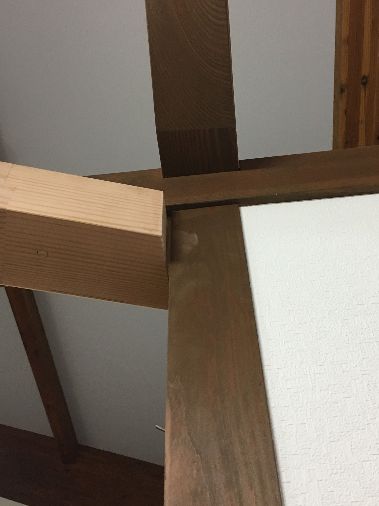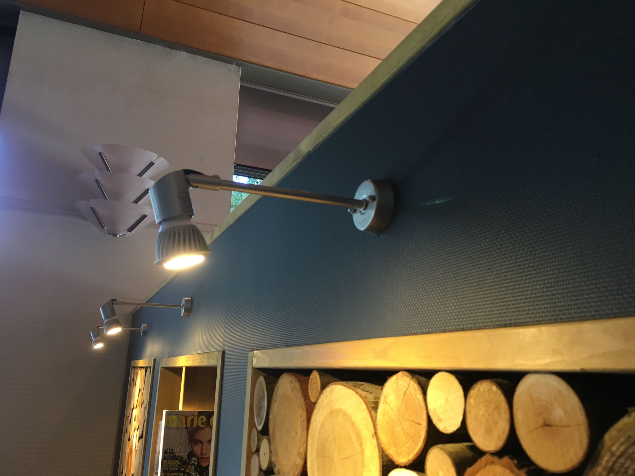 木の丸太を20CMにカットしたものをパーテーションのアクセントにしました。ネイビーブルーの部分は、ビニールクロスです。本や置物が飾れるよう棚を作りました。照明も効果的!!