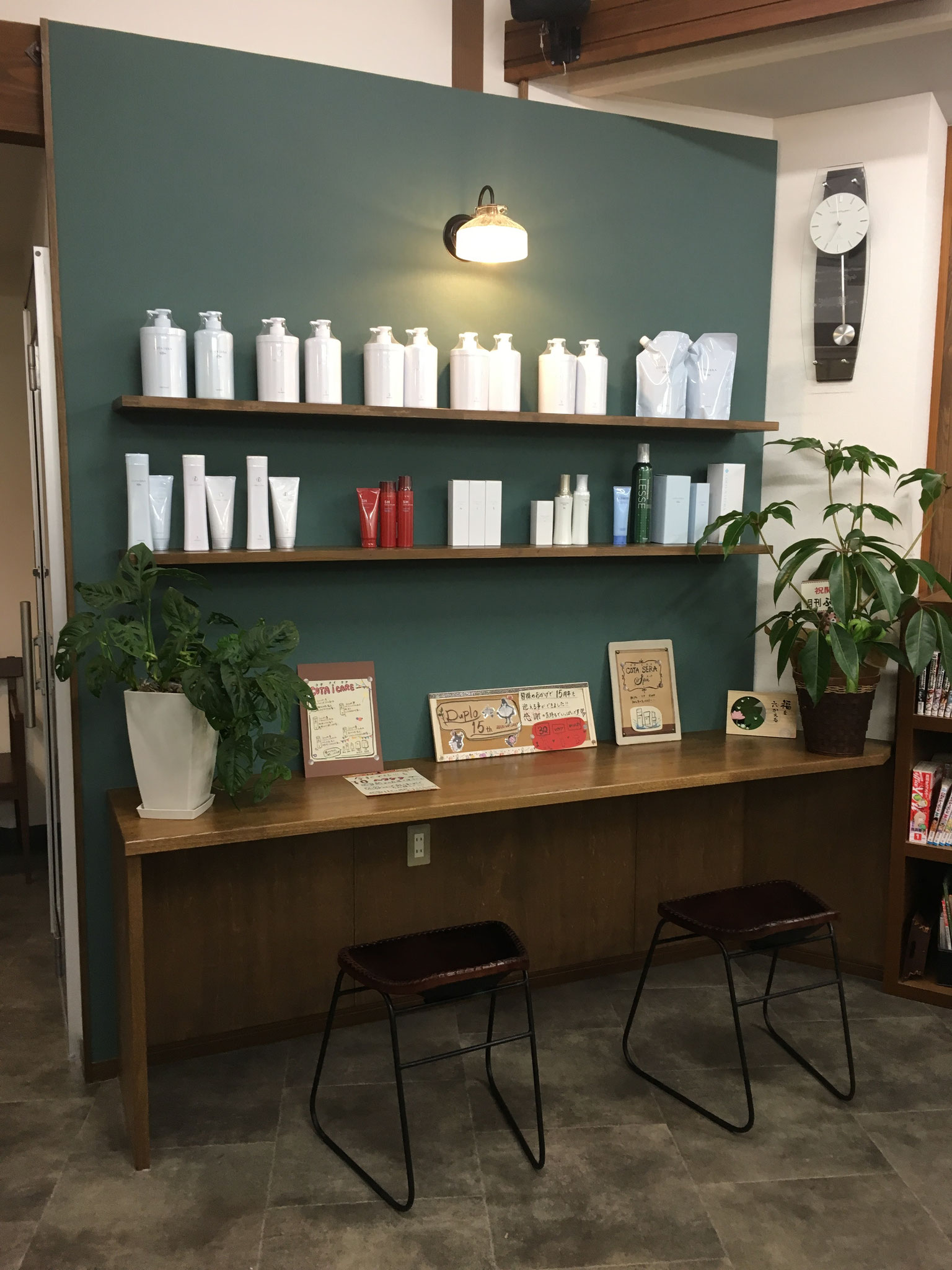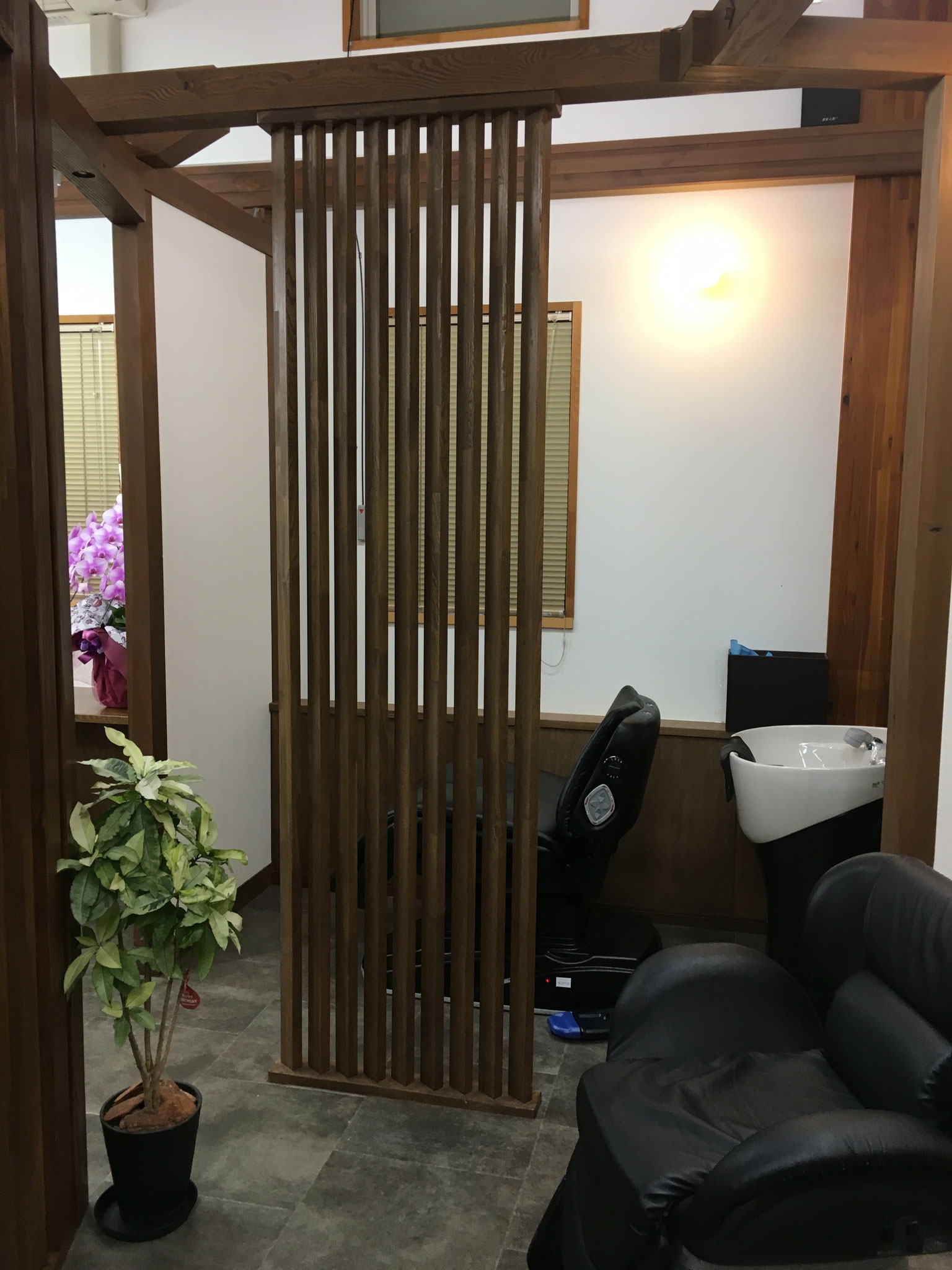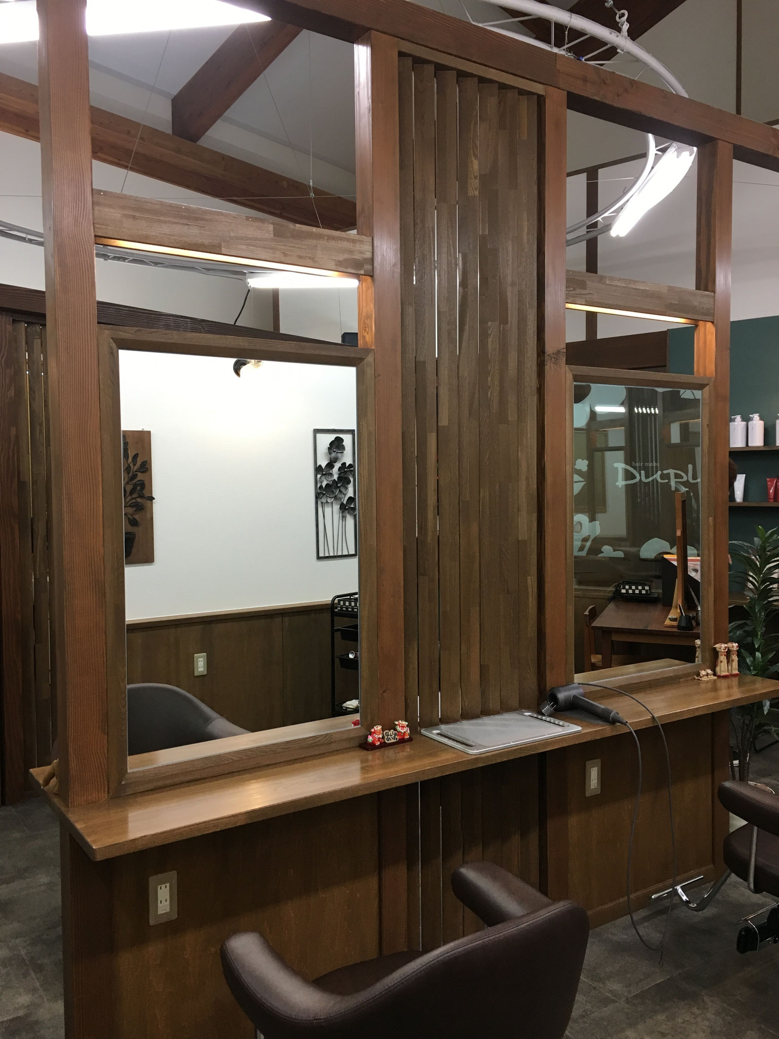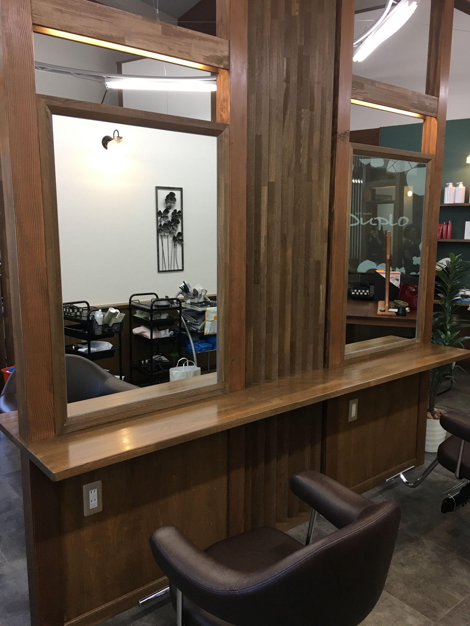 40代女性オーナーから、美容室リニューアルのご依頼。日々のちょっとした使いにくさをとにかくヒアリングして、プランニング。大人の女性がくつろげるインテリアに。既存の木製部分を活かしつつ、新たに中央に木製ルーバー・鏡・カウンターで目隠しパーテーションを作成しました。グリーンとアイアンのインテリア小物をアクセントにしています。オーナーさんが選んでくれた家具ともピッタリです。