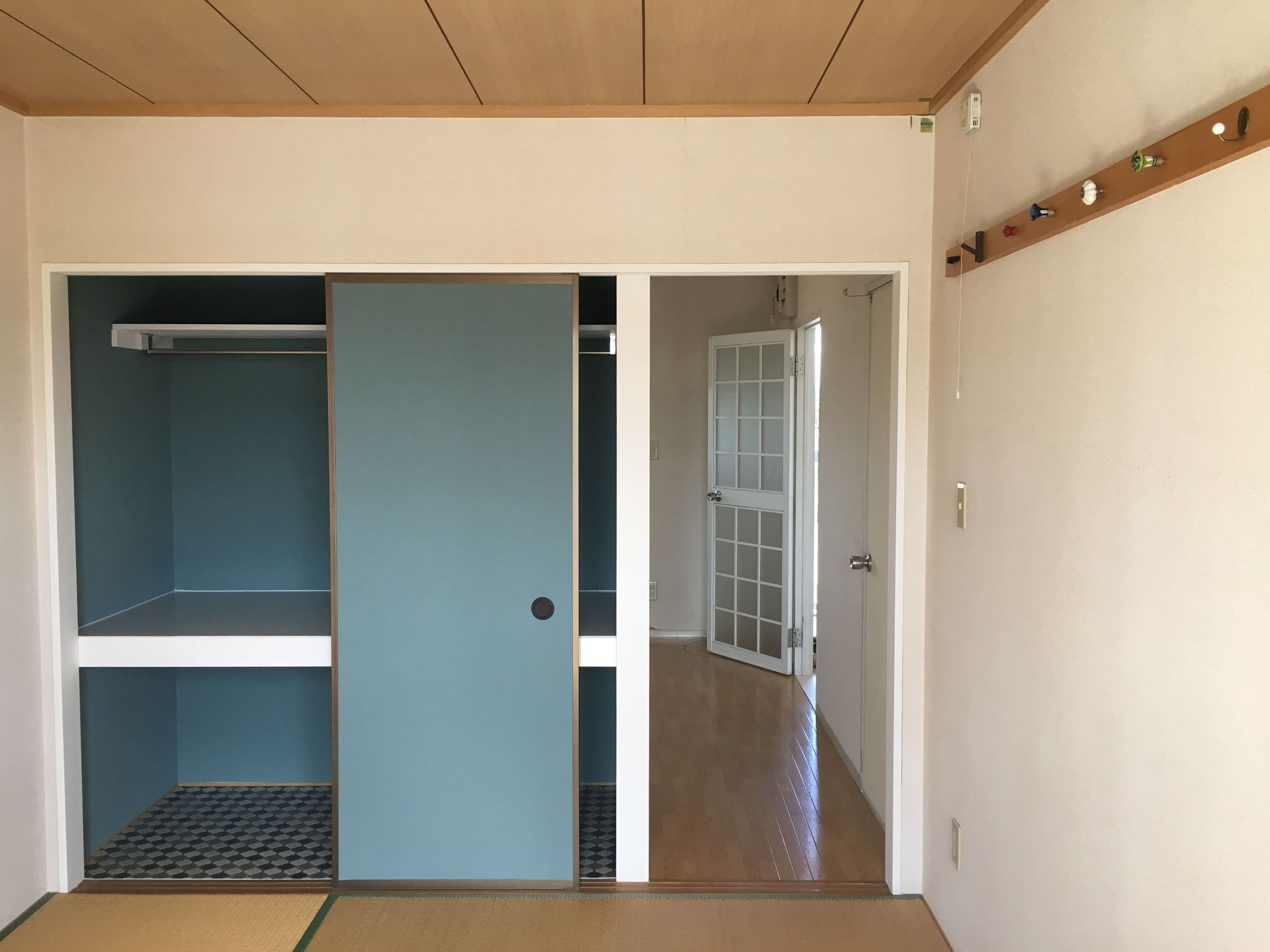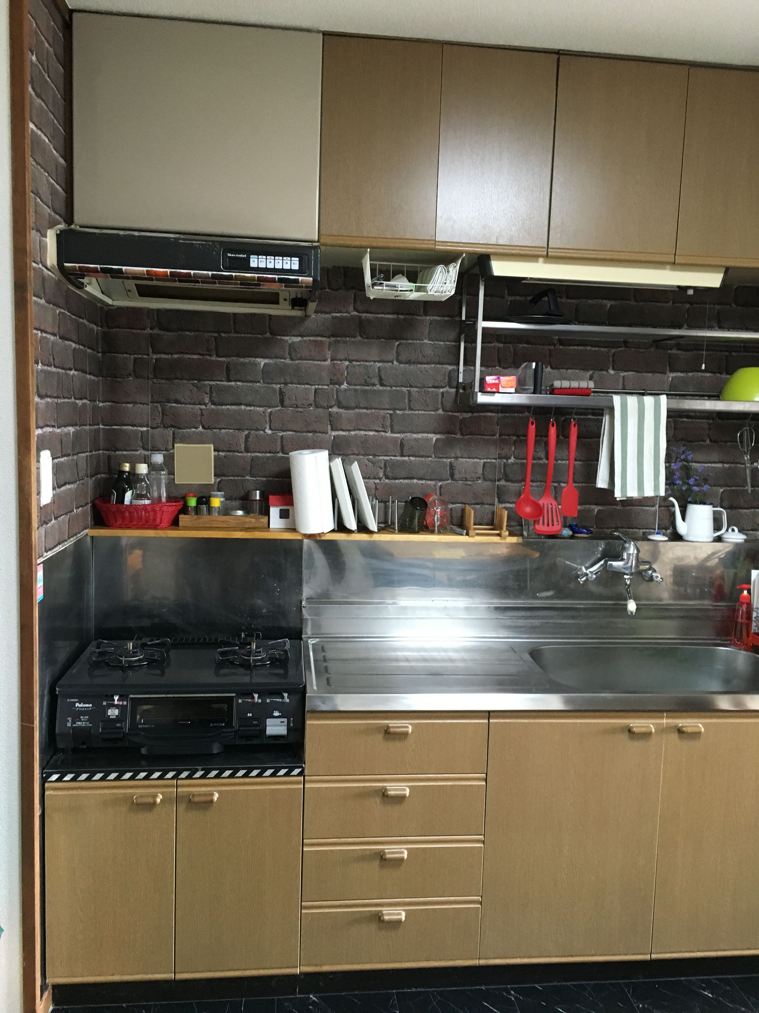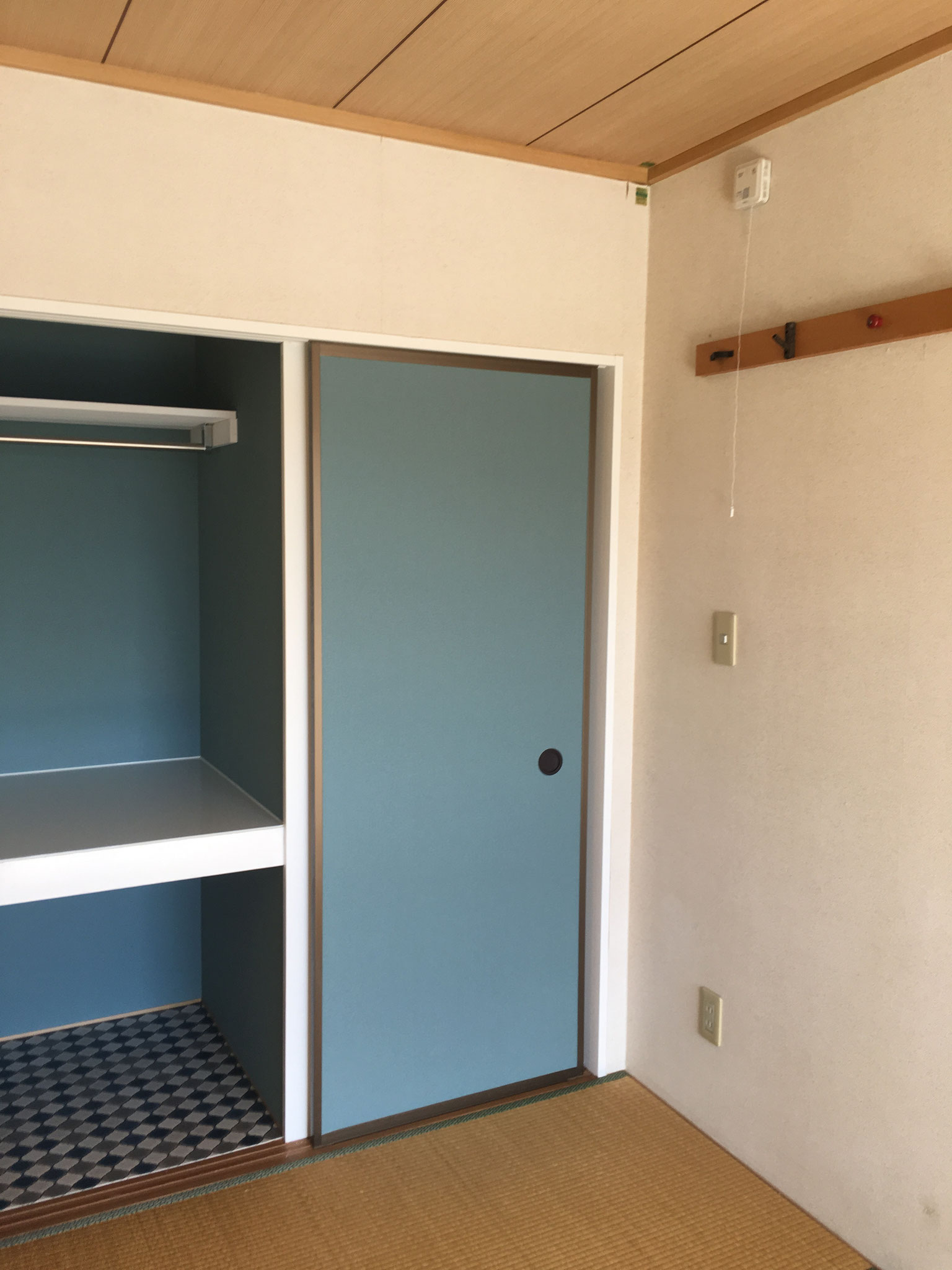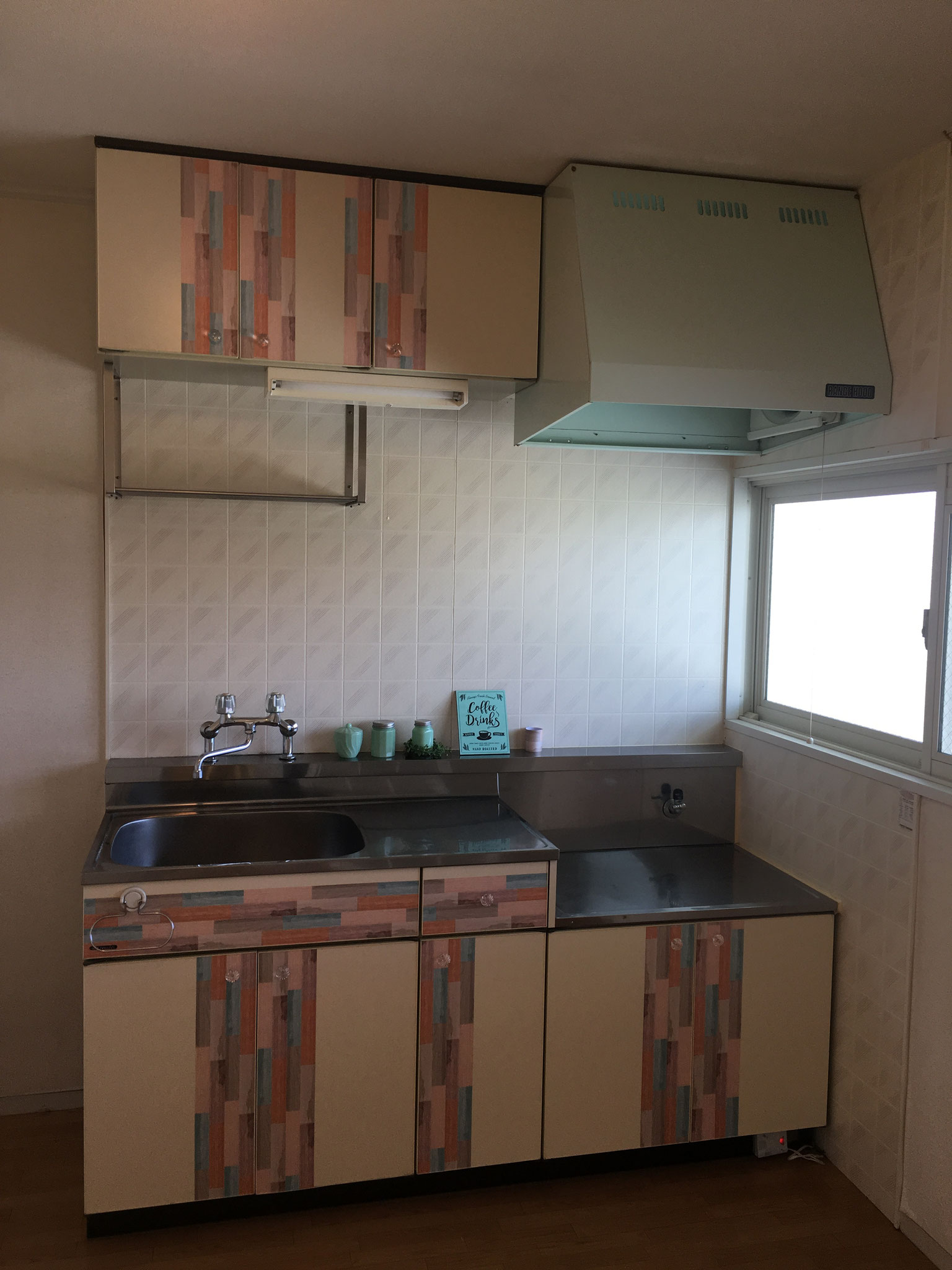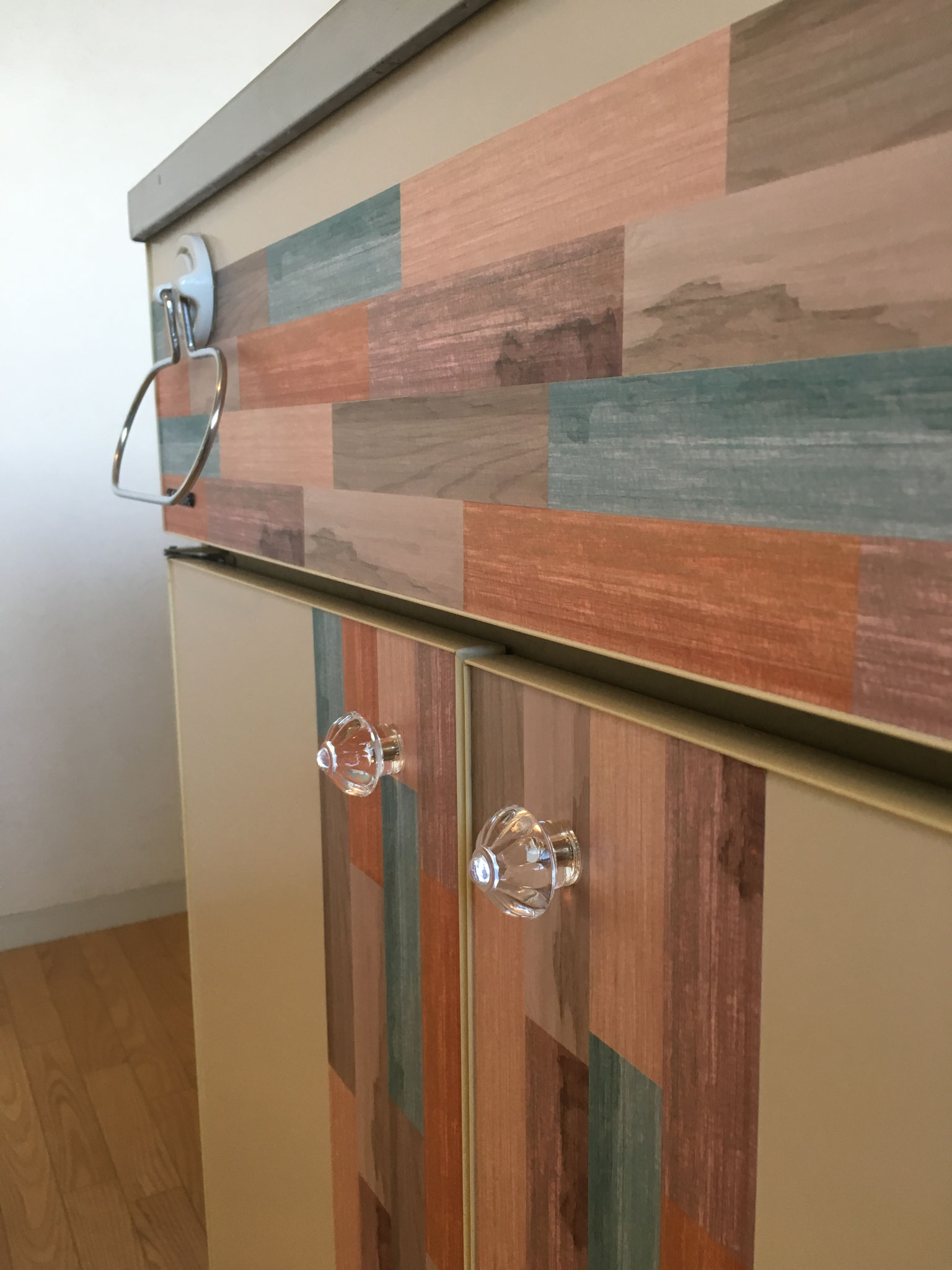 アパートのクロスはアイボリーが多いですよね!!一部の壁のクロスを変えたり、押入れや収納内部のクロスをアクセントカラーにするだけで、楽しい空間に変わります。キッチンのレンジフードのミントグリーンンがなんとも可愛くて、今回のコーディネートのイメージはここから膨らみました。キッチン扉のつまみを変え、一部にテープをはりました。ちょっとしたことで、自分の家を好きになるきっかけになればと思います。