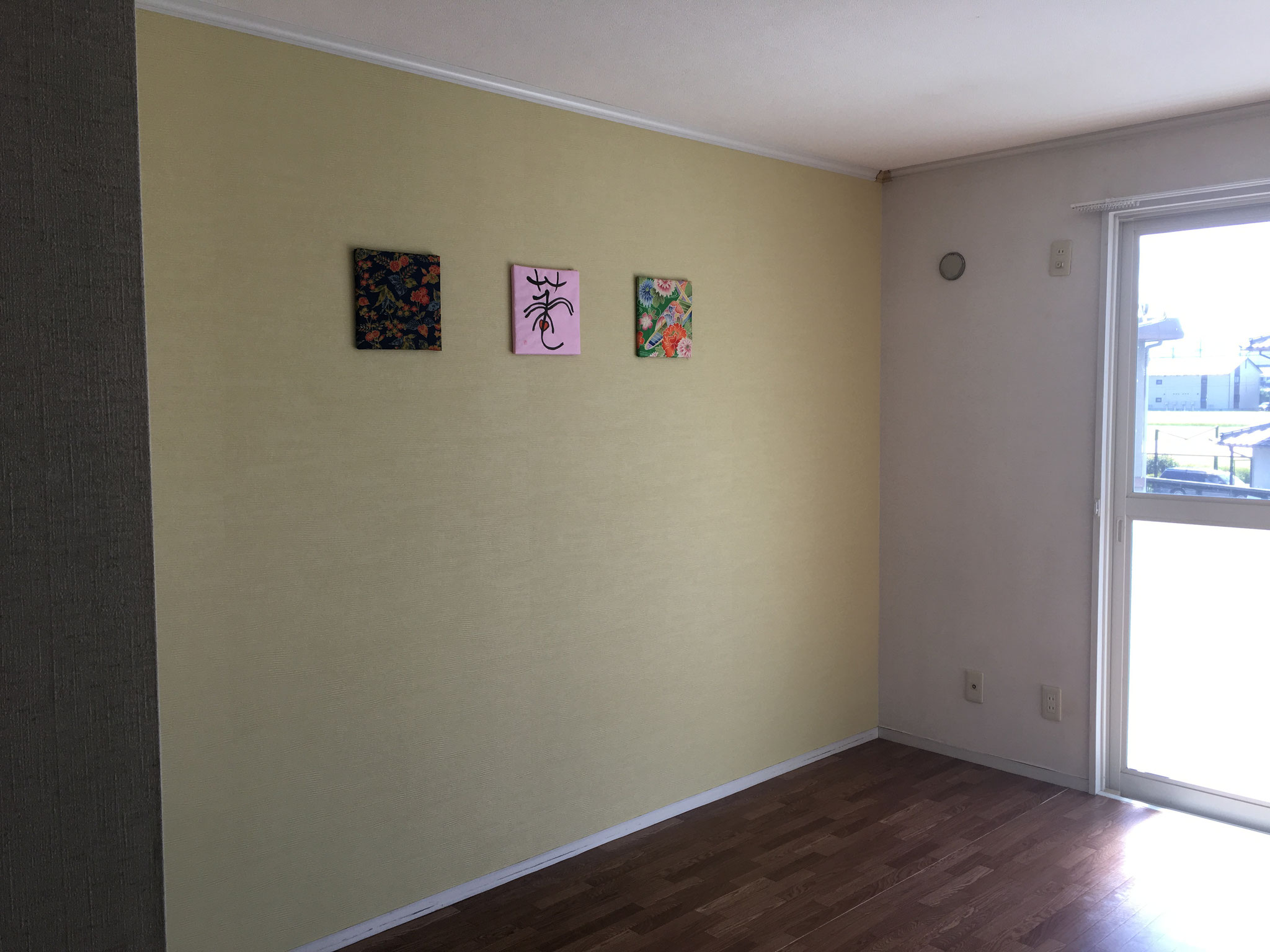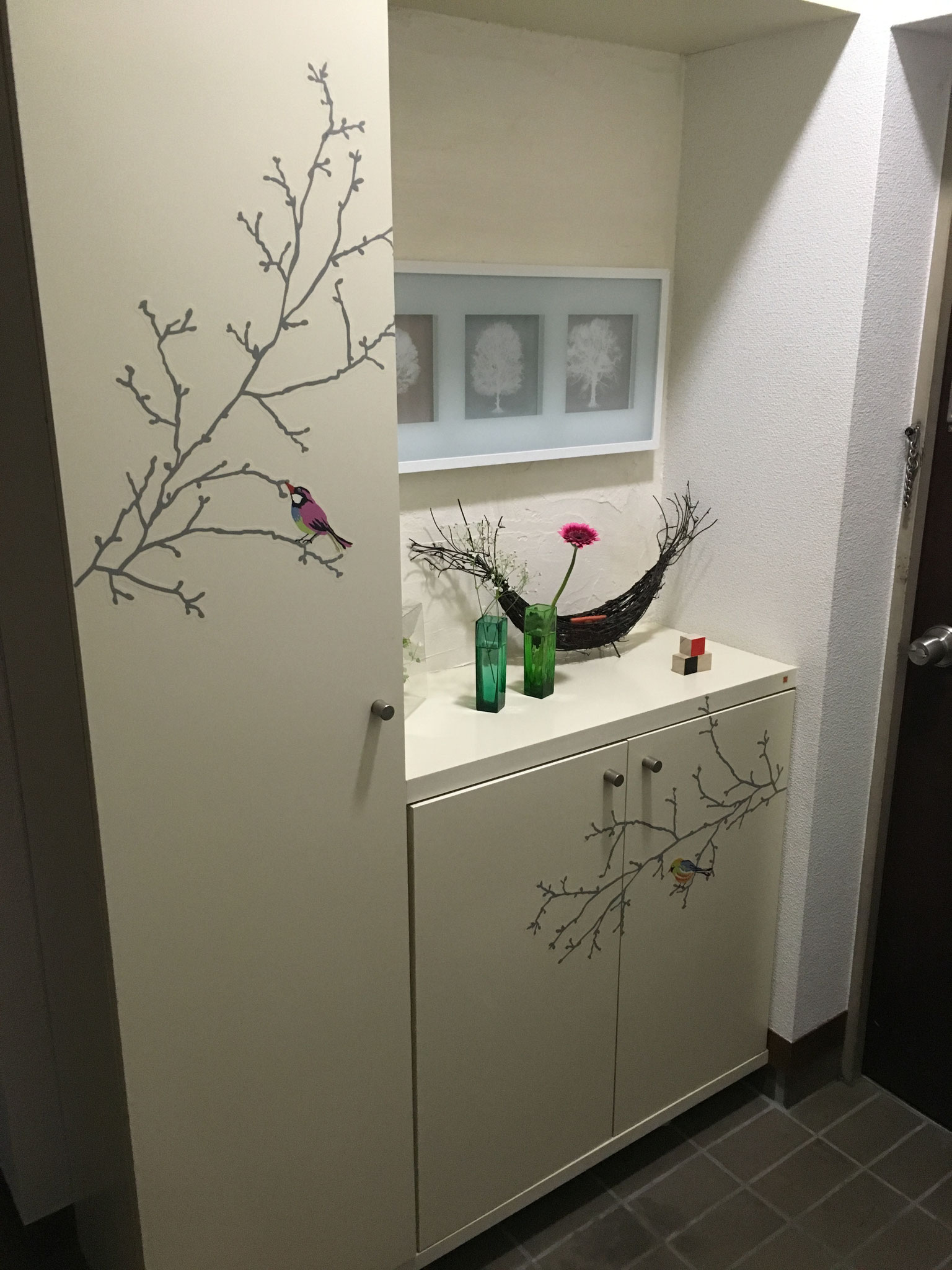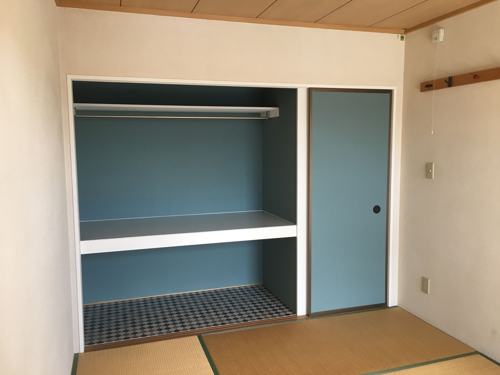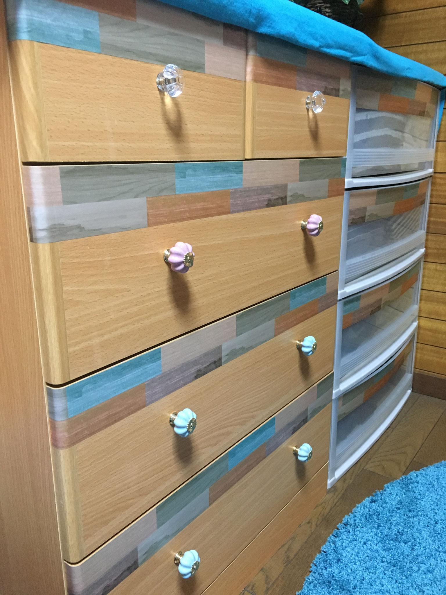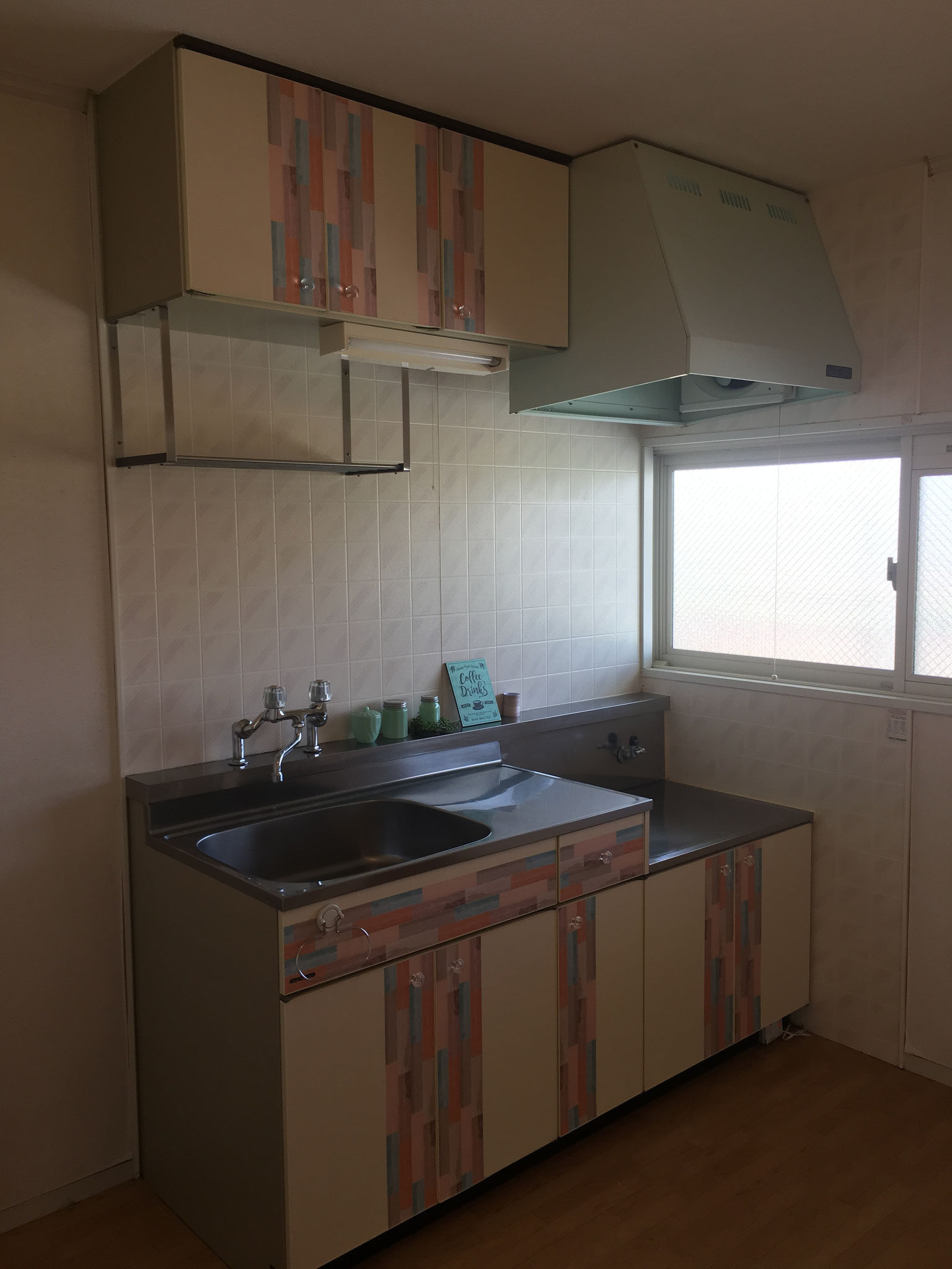 アパートのクロスはアイボリーが多いですよね!!一部の壁のクロスを変えたり、押入れや収納内部のクロスをアクセントカラーにするだけで、楽しい空間に変わります。キッチンのレンジフードのミントグリーンンがなんとも可愛くて、今回のコーディネートのイメージはここから膨らみました。キッチン扉のつまみを変え、一部にテープをはりました。ちょっとしたことで、自分の家を好きになるきっかけになればと思います。