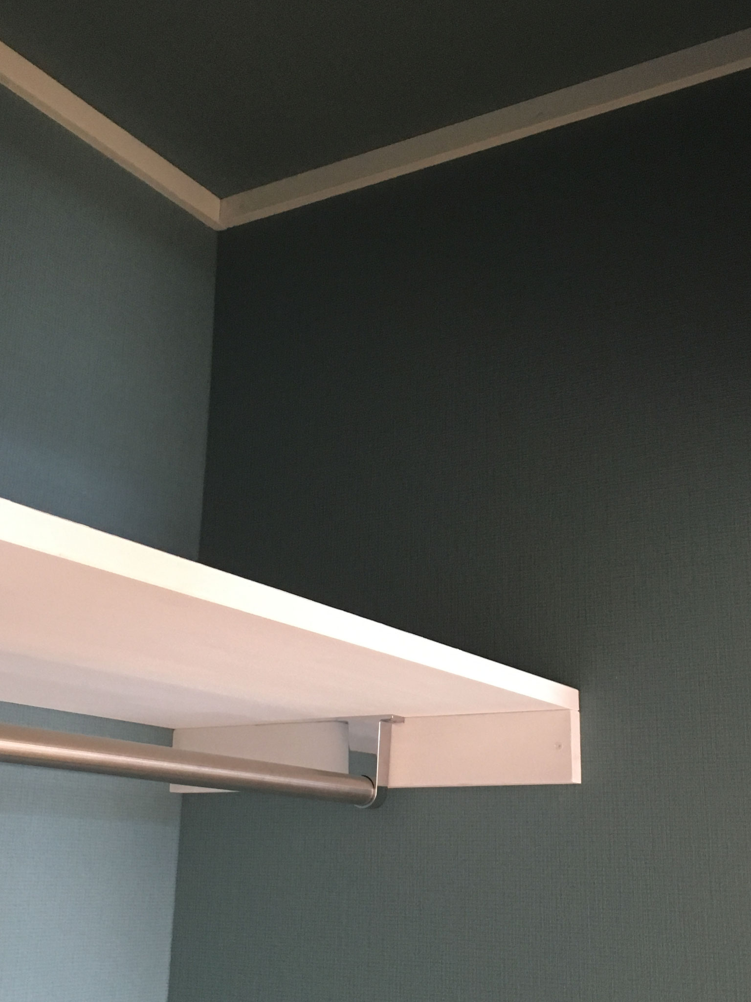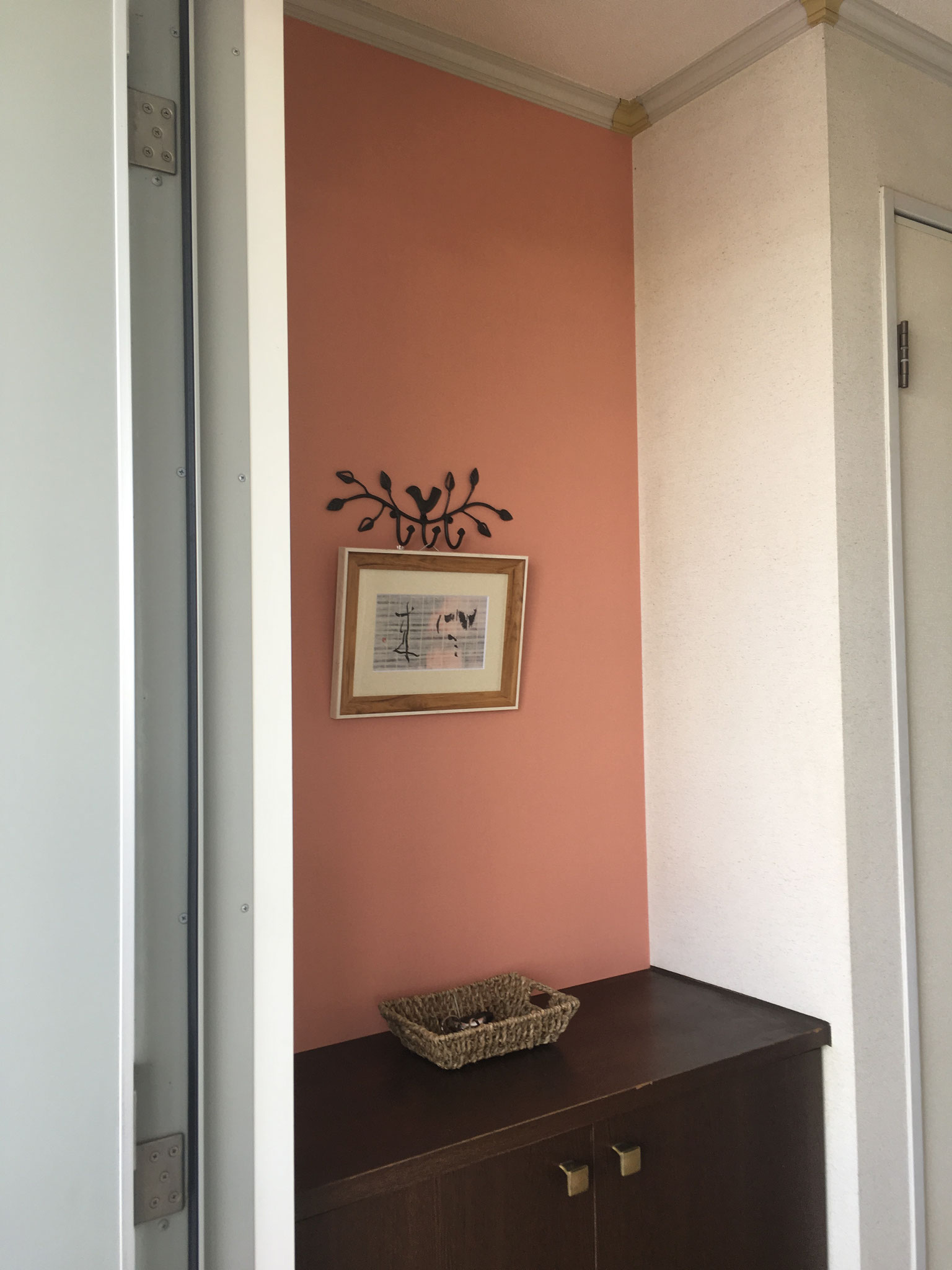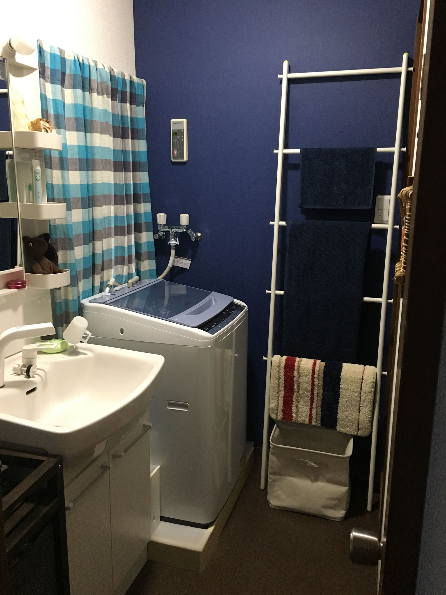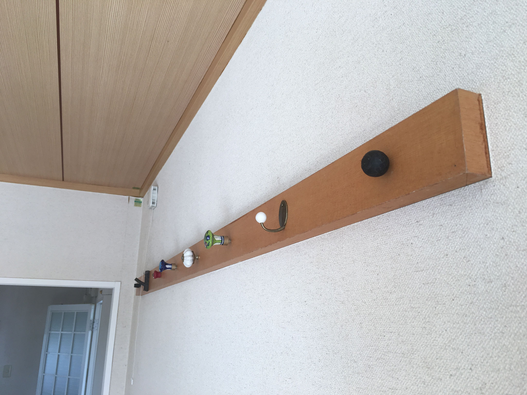 アパートのクロスはアイボリーが多いですよね!!一部の壁のクロスを変えたり、押入れや収納内部のクロスをアクセントカラーにするだけで、楽しい空間に変わります。キッチンのレンジフードのミントグリーンンがなんとも可愛くて、今回のコーディネートのイメージはここから膨らみました。キッチン扉のつまみを変え、一部にテープをはりました。ちょっとしたことで、自分の家を好きになるきっかけになればと思います。