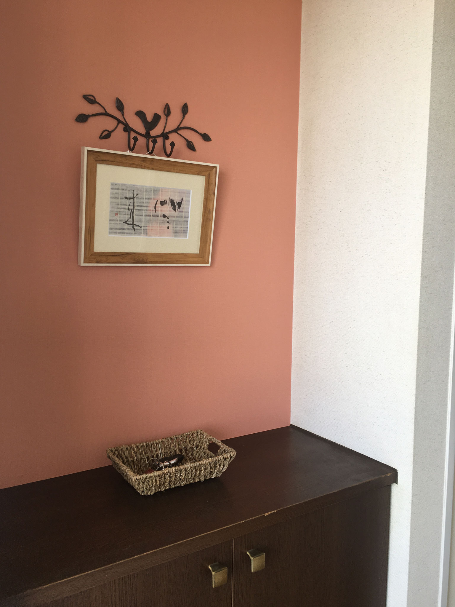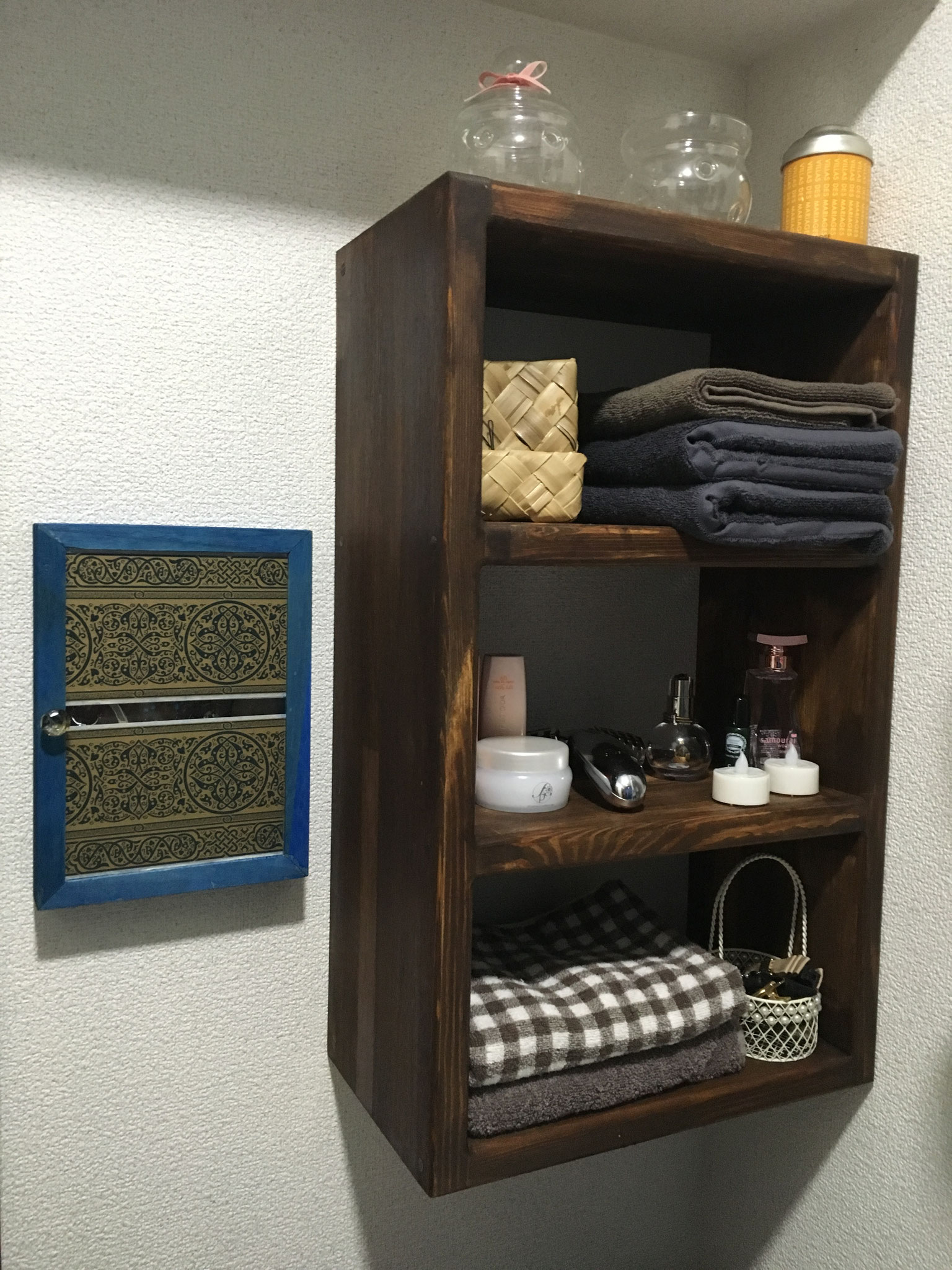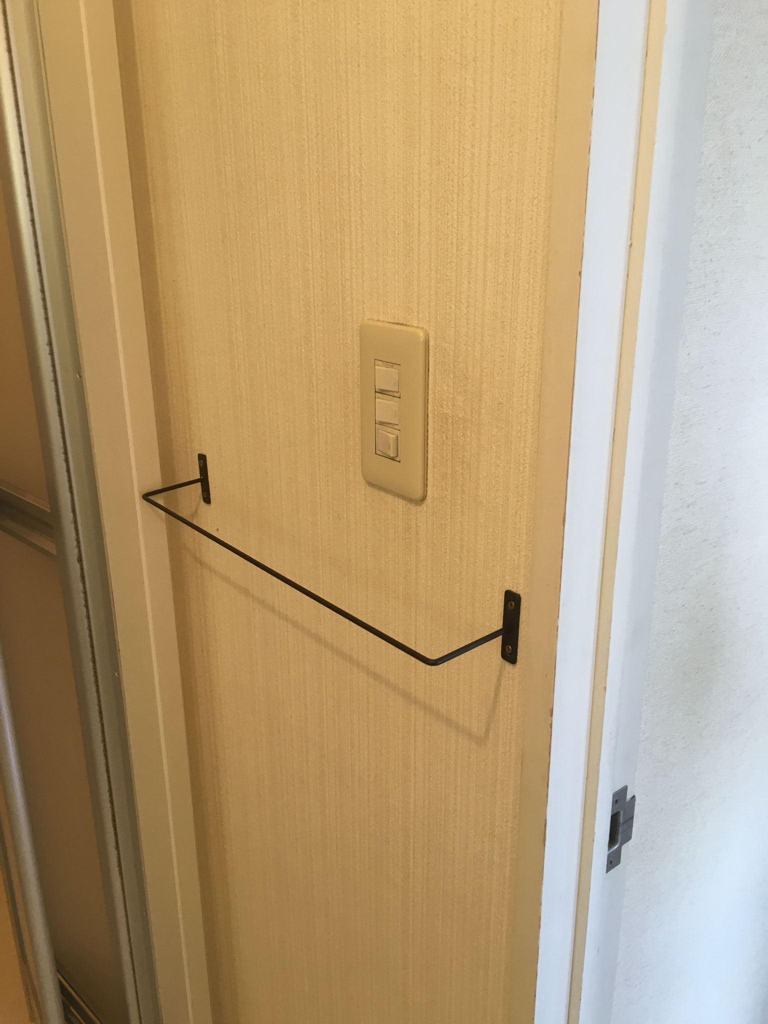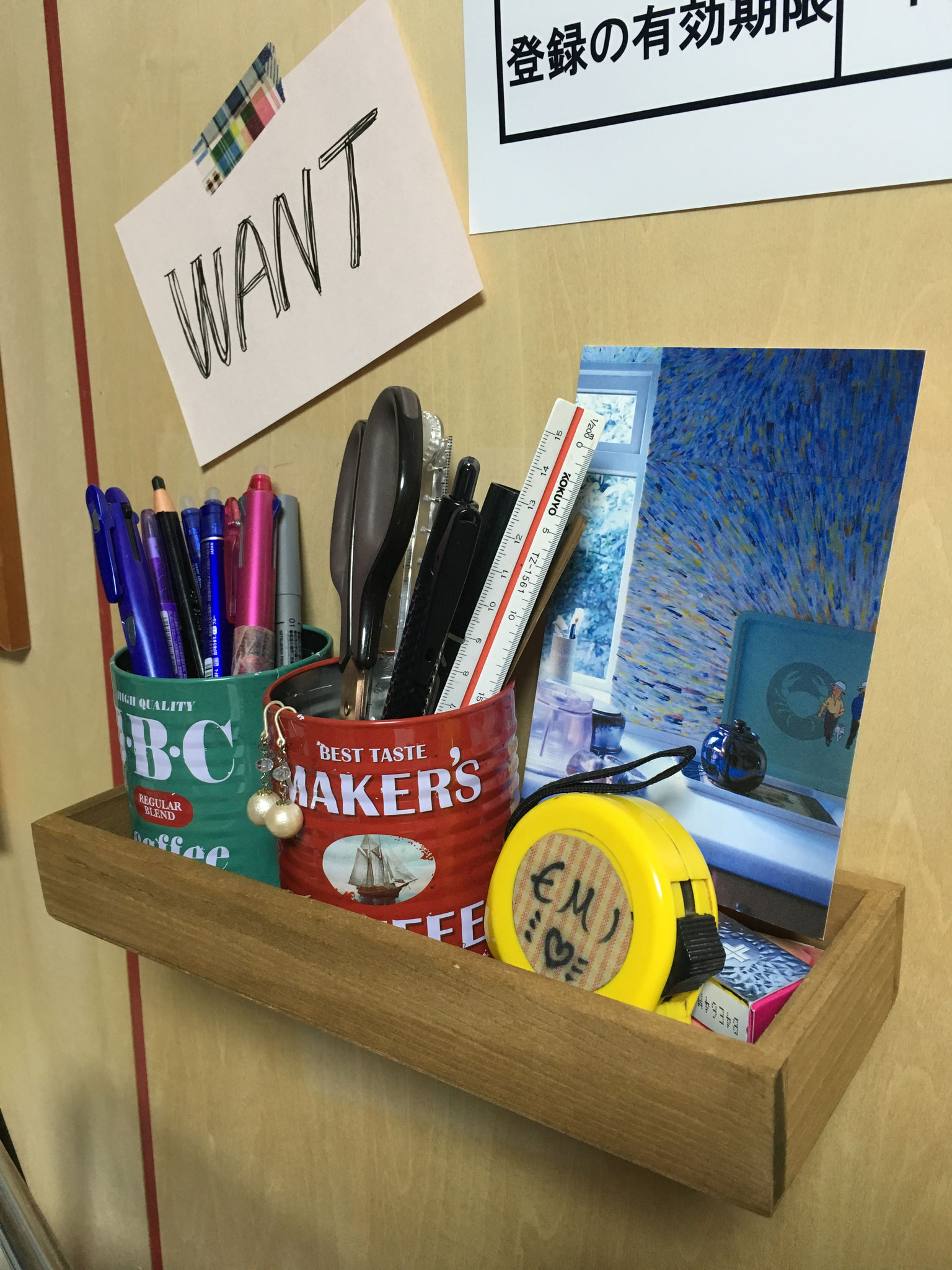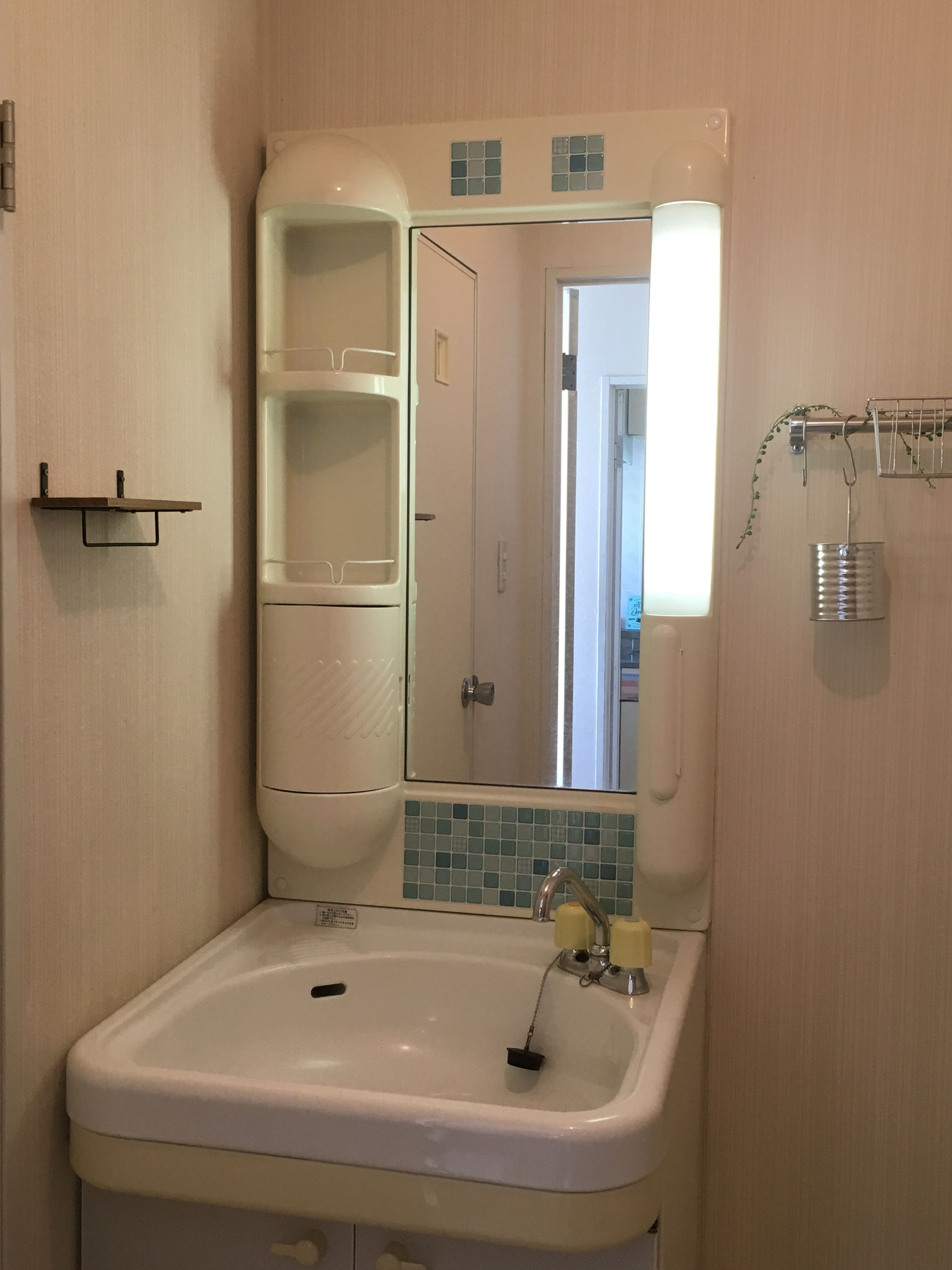 アパートのクロスはアイボリーが多いですよね!!一部の壁のクロスを変えたり、押入れや収納内部のクロスをアクセントカラーにするだけで、楽しい空間に変わります。キッチンのレンジフードのミントグリーンンがなんとも可愛くて、今回のコーディネートのイメージはここから膨らみました。キッチン扉のつまみを変え、一部にテープをはりました。ちょっとしたことで、自分の家を好きになるきっかけになればと思います。