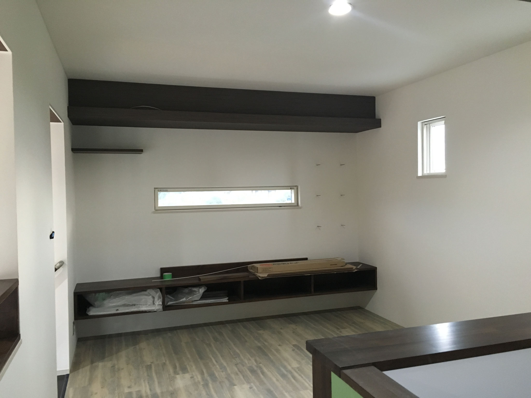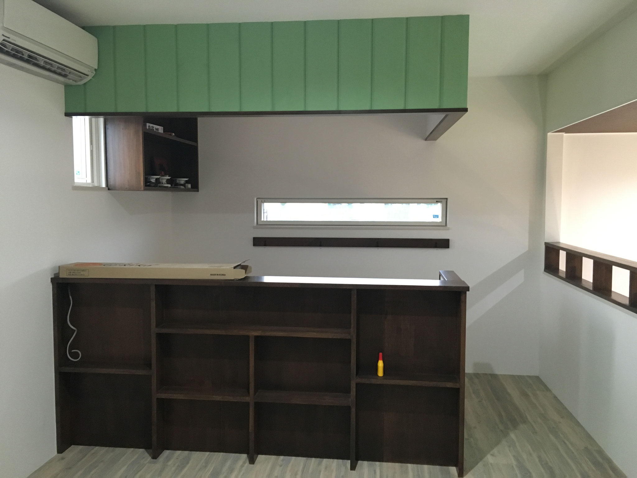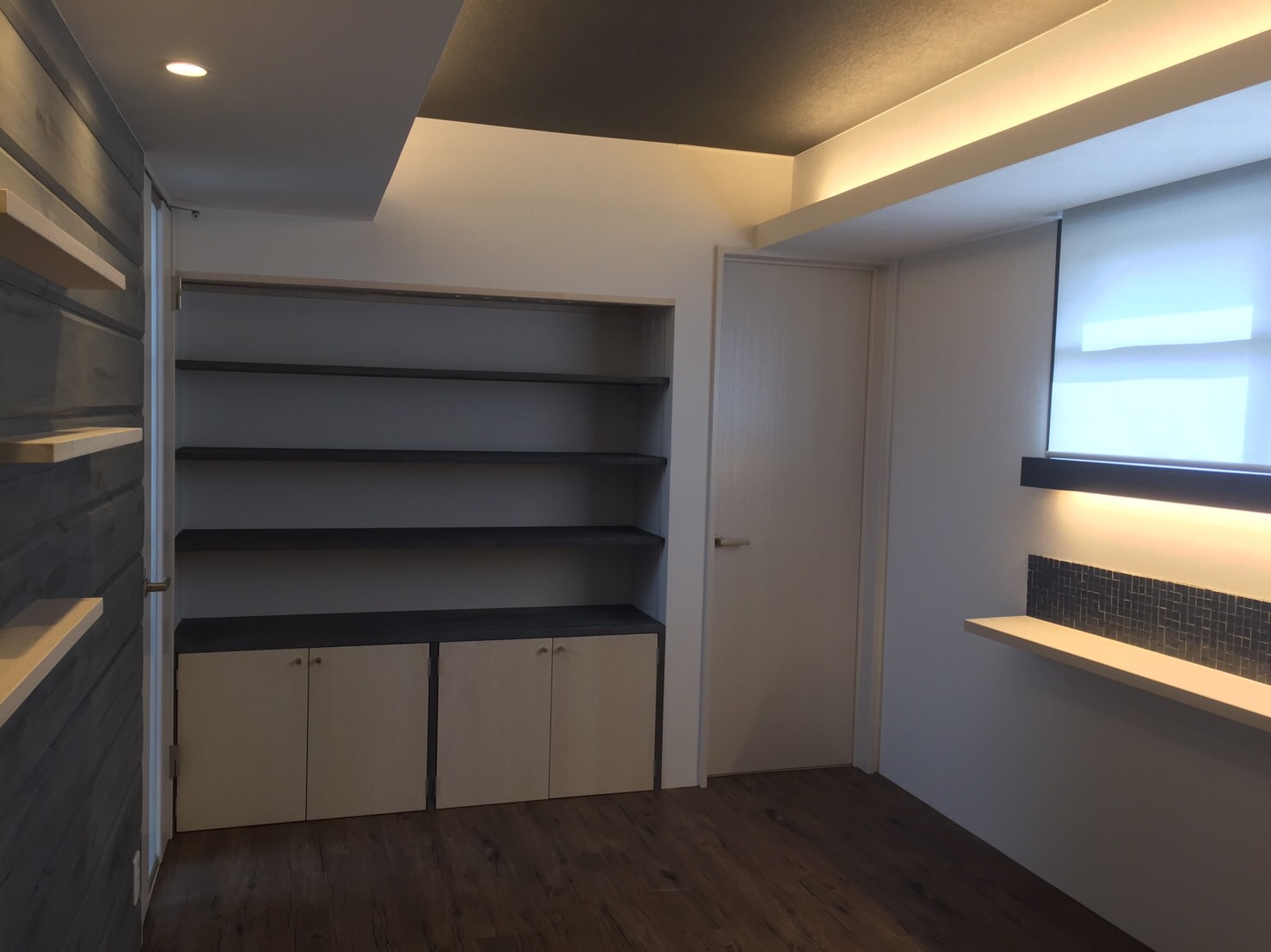 12帖の洋室を、生活がイメージできるような打ち合わせスペースにリノベーションしたいと、株式会社 YUIKEN 社長 油井さんからの依頼。お家のリビングダイニングにいるような雰囲気で打ち合わせでき、かつ、こんな風に造作できますという提案も兼ねています。TVのスペースや書斎も造作してしまえば、あとから家具に悩むこともありません。どんな暮らしがしたいか、とことん話せる空間を提案しました。