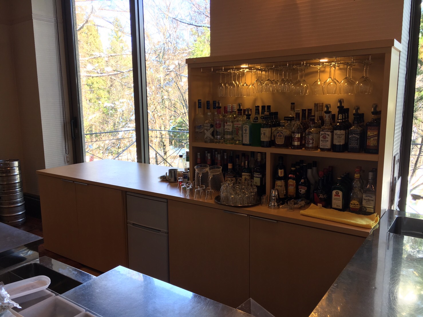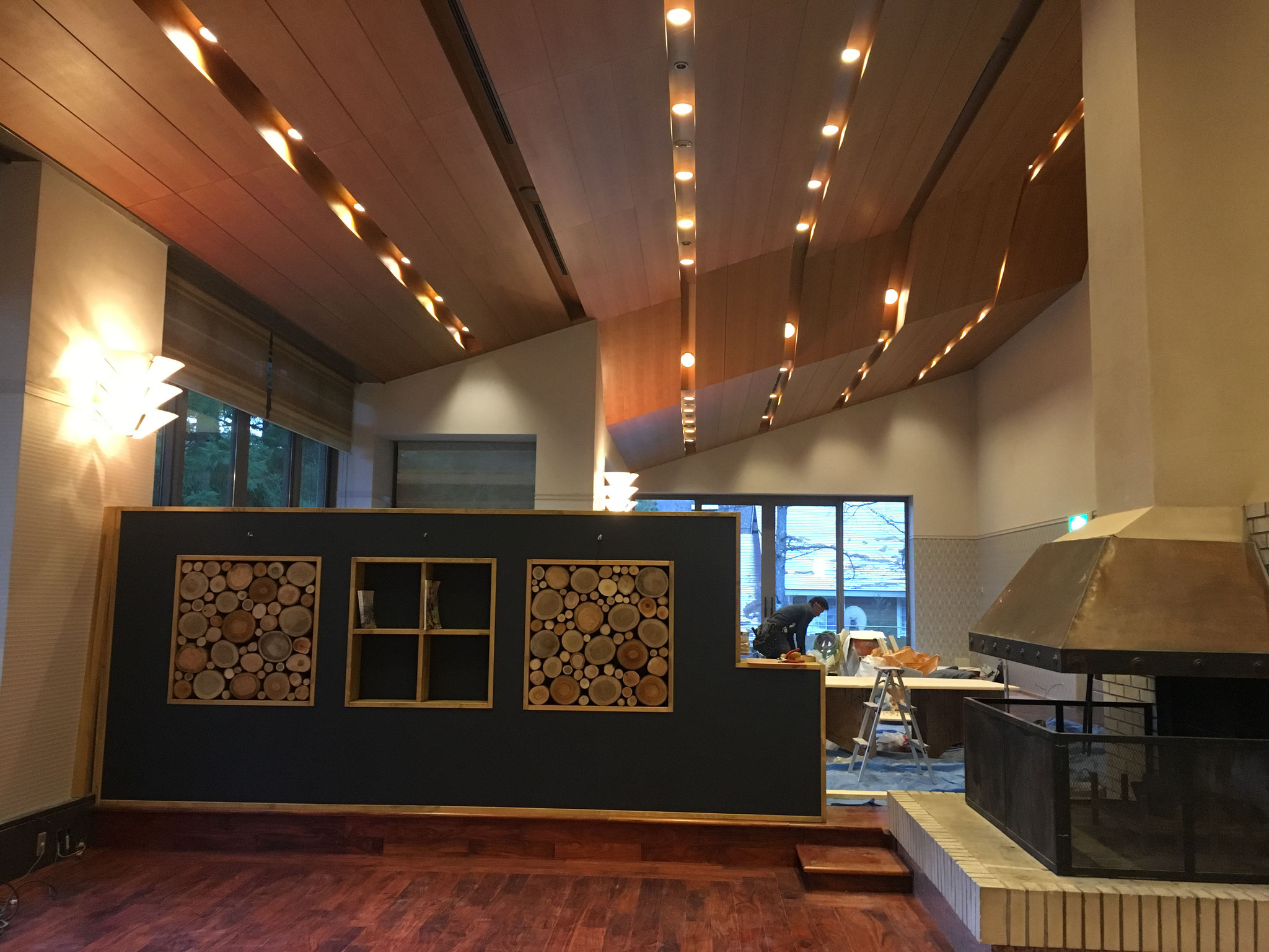 白馬で思いっきりスキーを楽しみたい方が多く宿泊するホテル。オーストラリア人のオーナーと、英語ができない私・・間に日本語と英語が出来る方をホテルスタッフを頼りに要望を聴きだした。スケッチしながらのトークはこの打ち合わせでも役にたった。ラウンジと食堂の丸太をアクセントにしたパーテーションと、朝食の配膳カウンターやバーコーナーの家具製作を手掛けました。