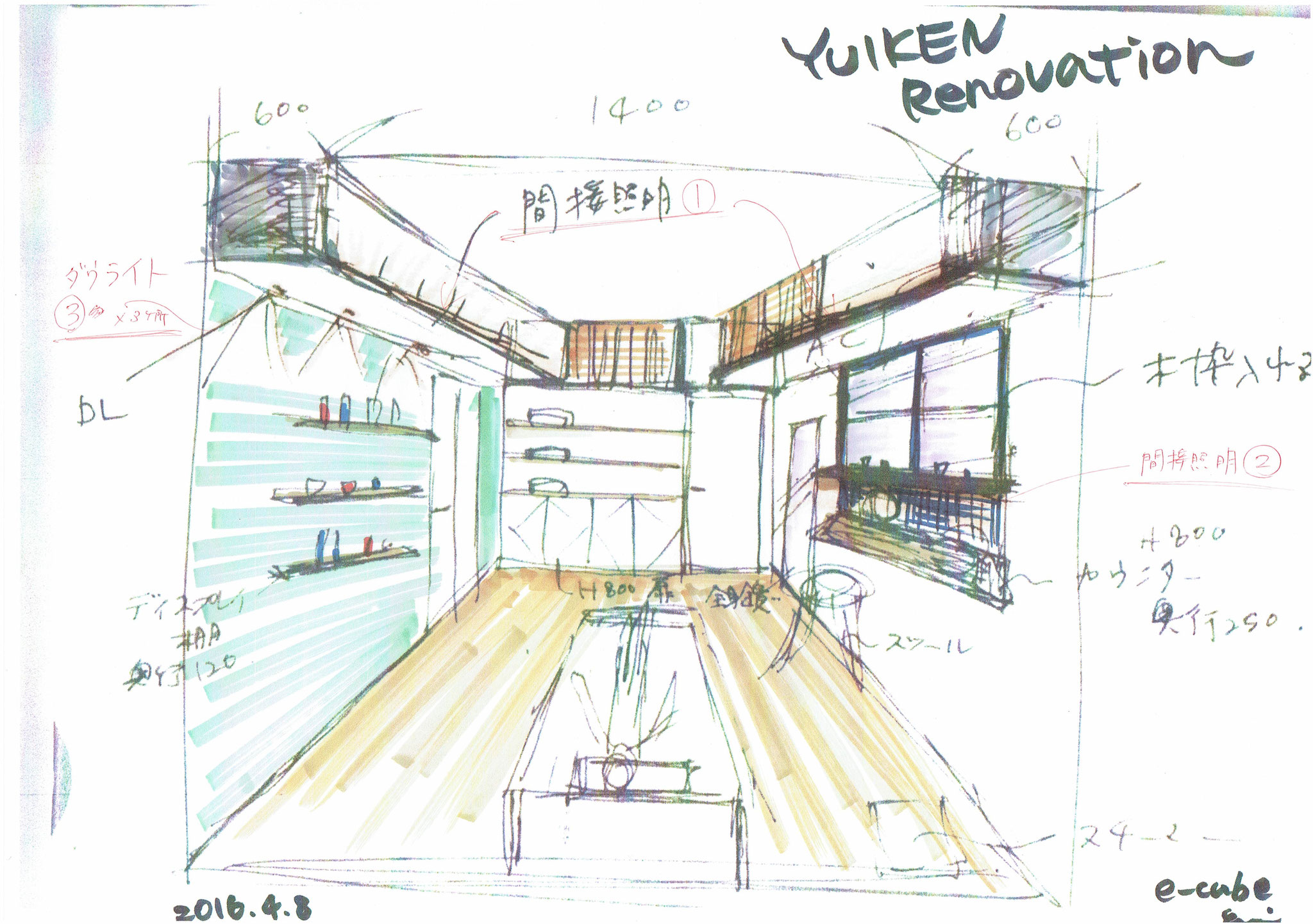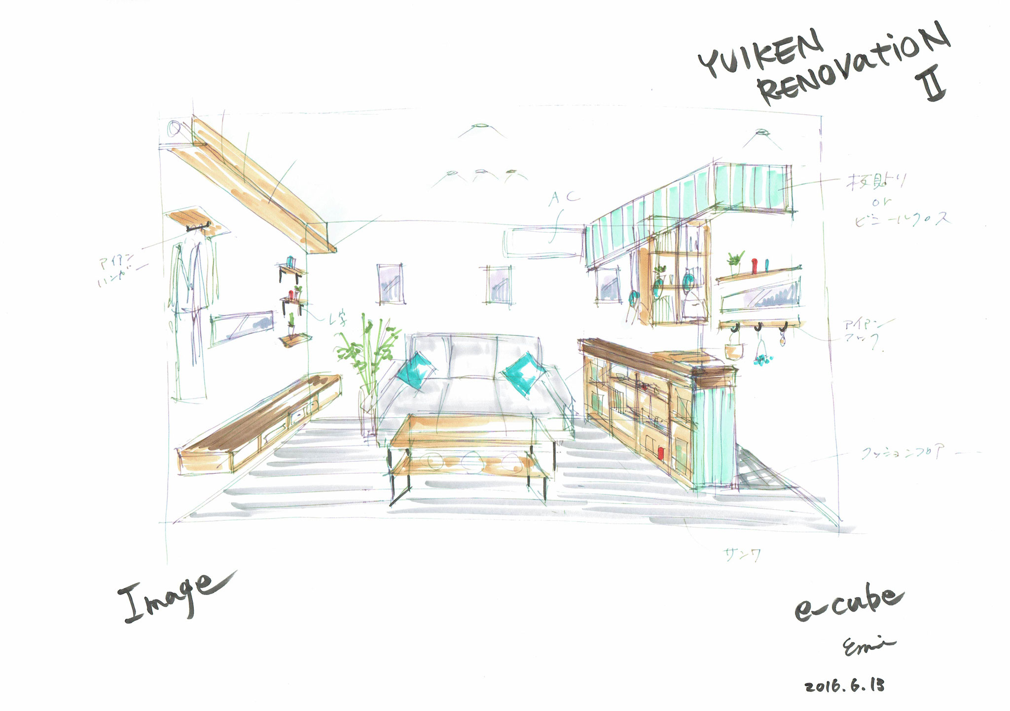 壁の一面を木を貼ったり、ちょっと個性的なクロスで遊んでみたり・・珪藻土で湿気対策してみたり、黒板塗料を塗り一部アートを楽しんでみたり。。今住んでる住空間はちょっとした工夫でワクワクしたものになります。この隙間にこんな収納棚が欲しいな、食器棚オリジナルで作りたい などなど、e-cubeではその場でスケッチをかきながら提案していきます。一緒に、今の家に愛着がもてるよう一工夫してみませんか!!