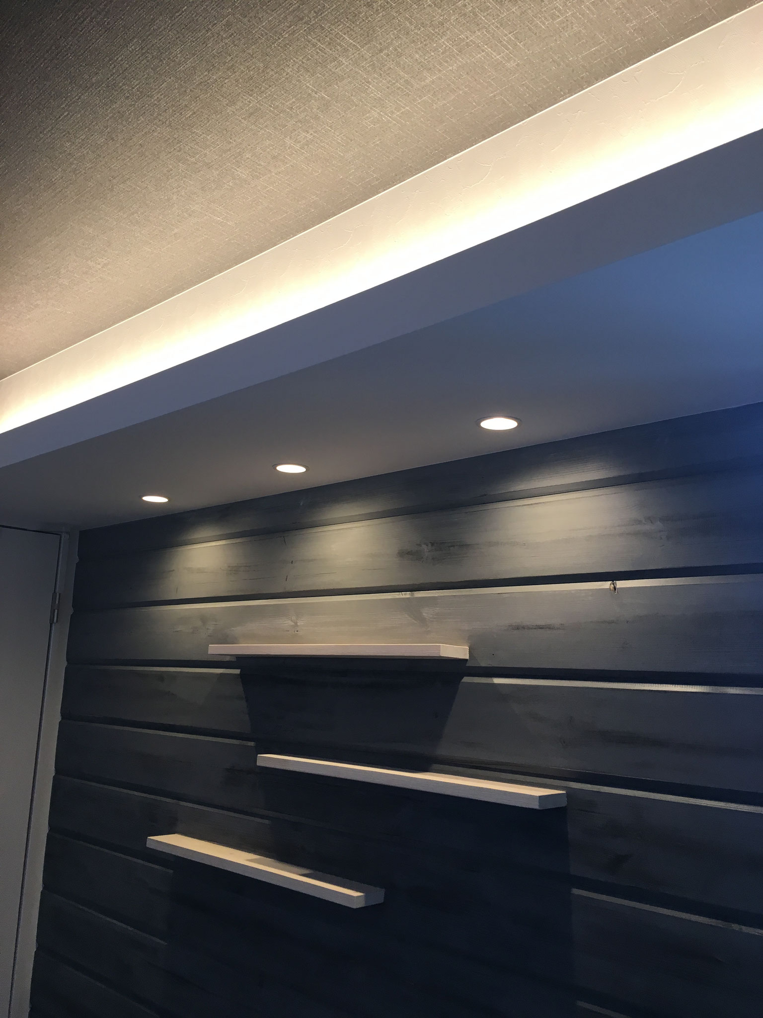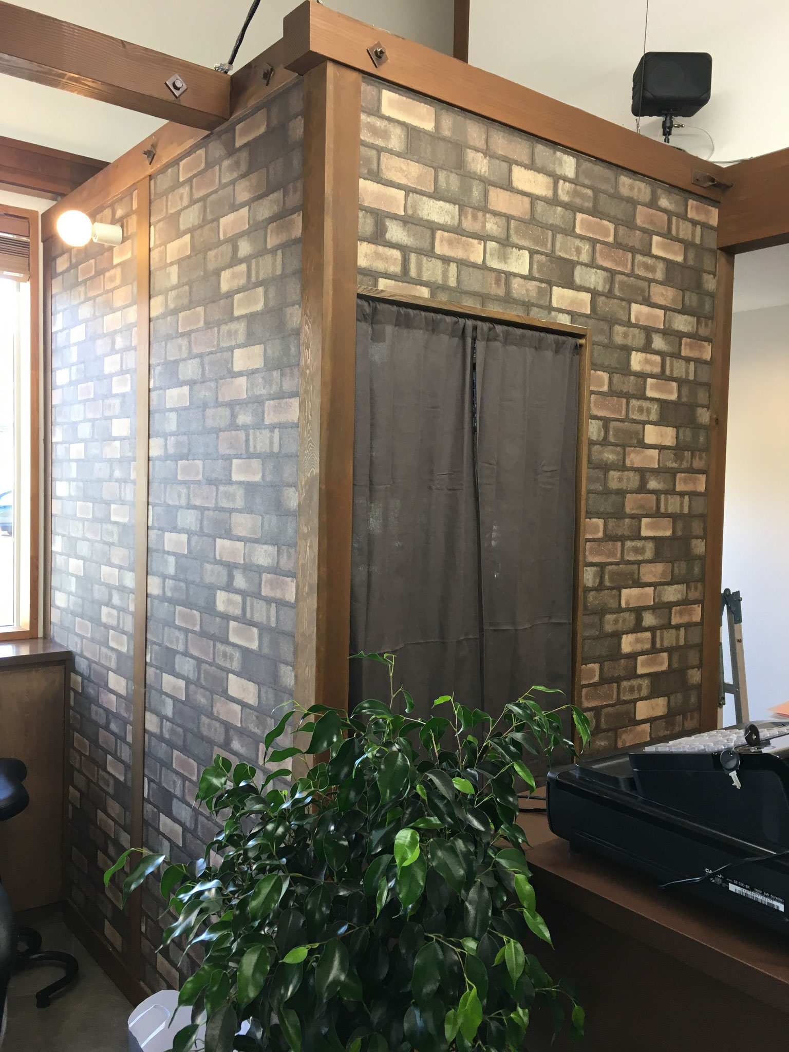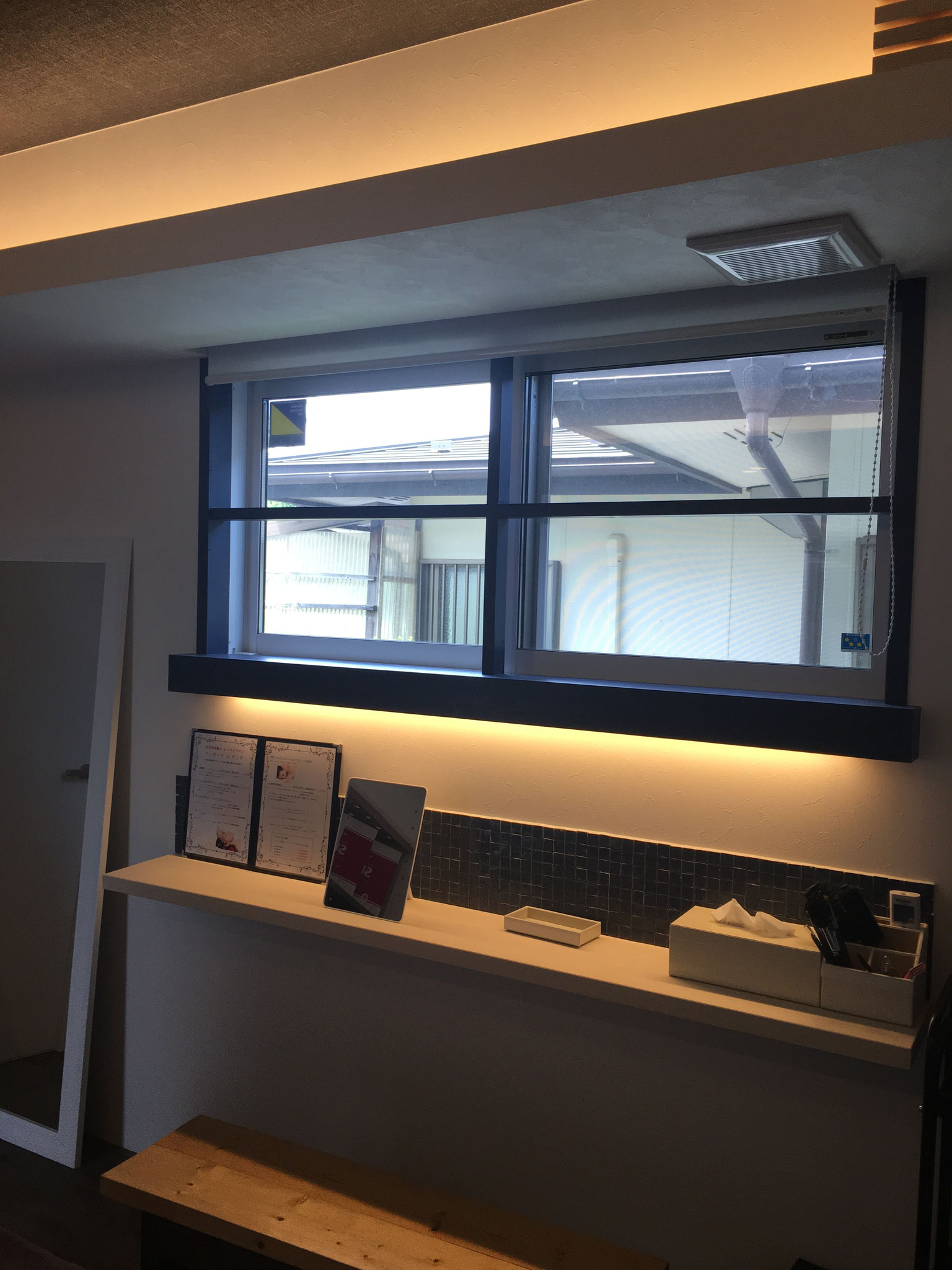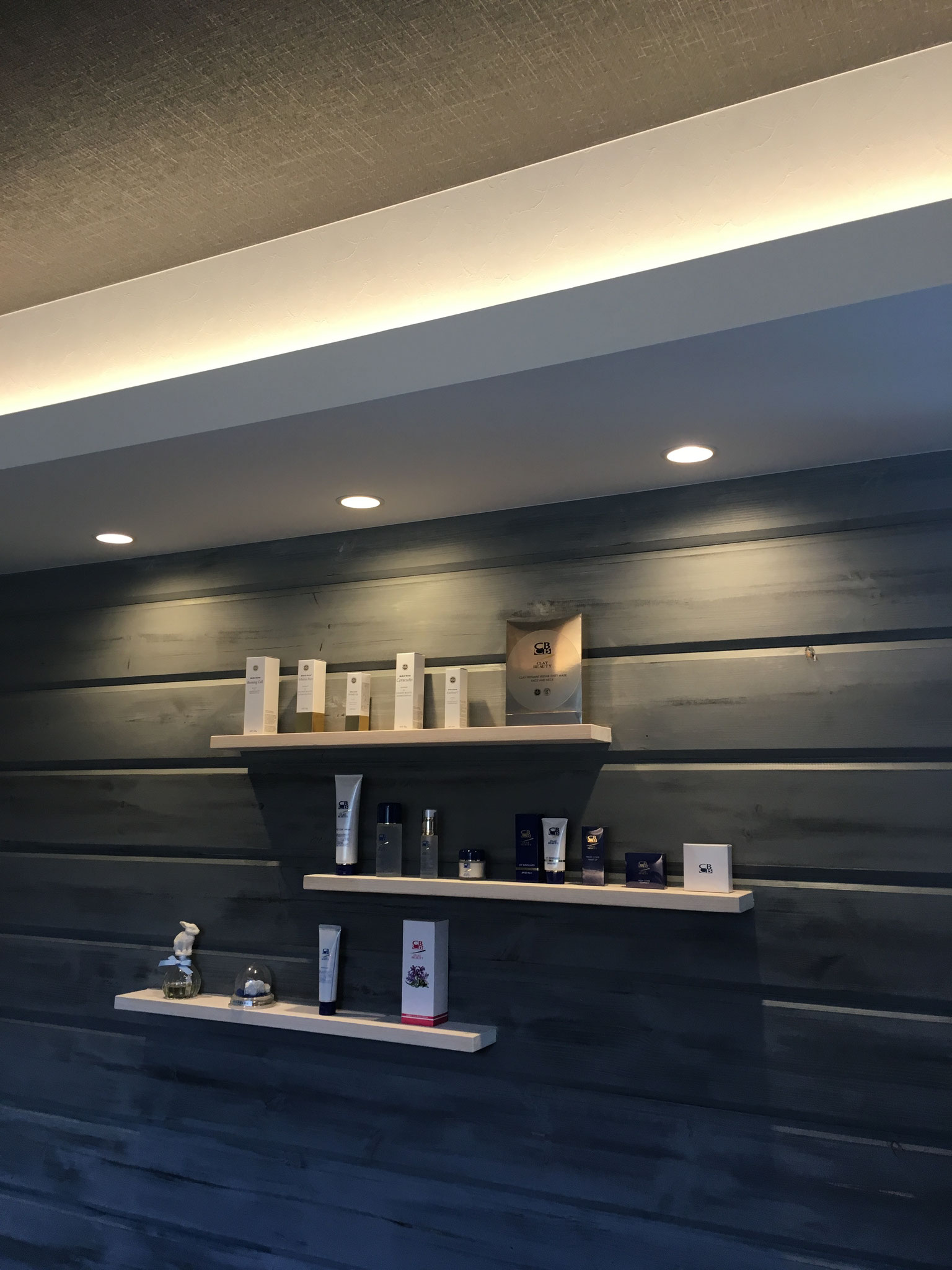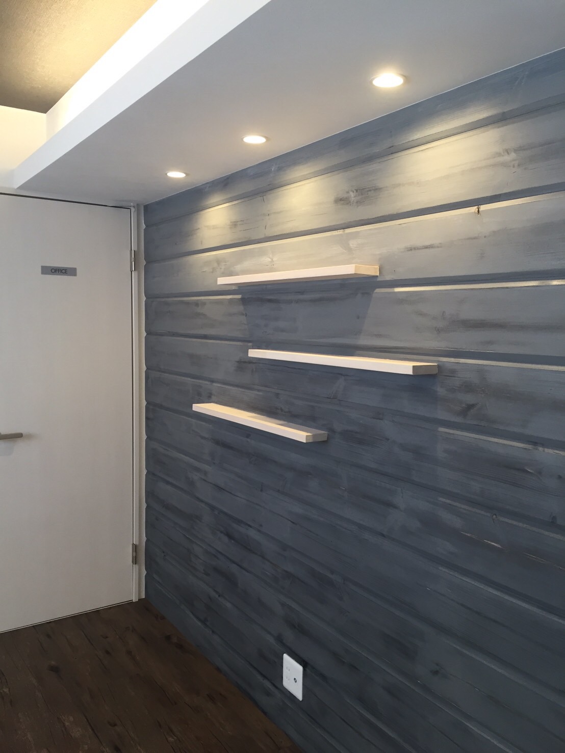 株式会社 YUIKEN 様より会議室6帖+収納をエステ空間にリノベーションの提案依頼をいただきました。施工は大工さんでもあるYUIKEN社長自らやっていました。間接照明でやわらかい雰囲気に。一面の壁を木を貼りグレーに塗装、ネイビーのモザイクタイルでアクセント。飾りた棚に商品をディスプレイできます。エステ後お化粧直しカウンターや備品の収納も提案させていただきました。