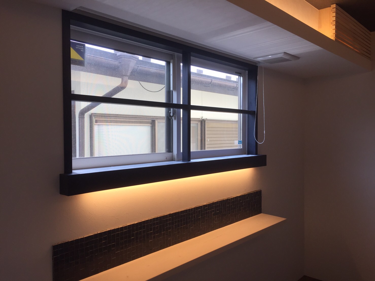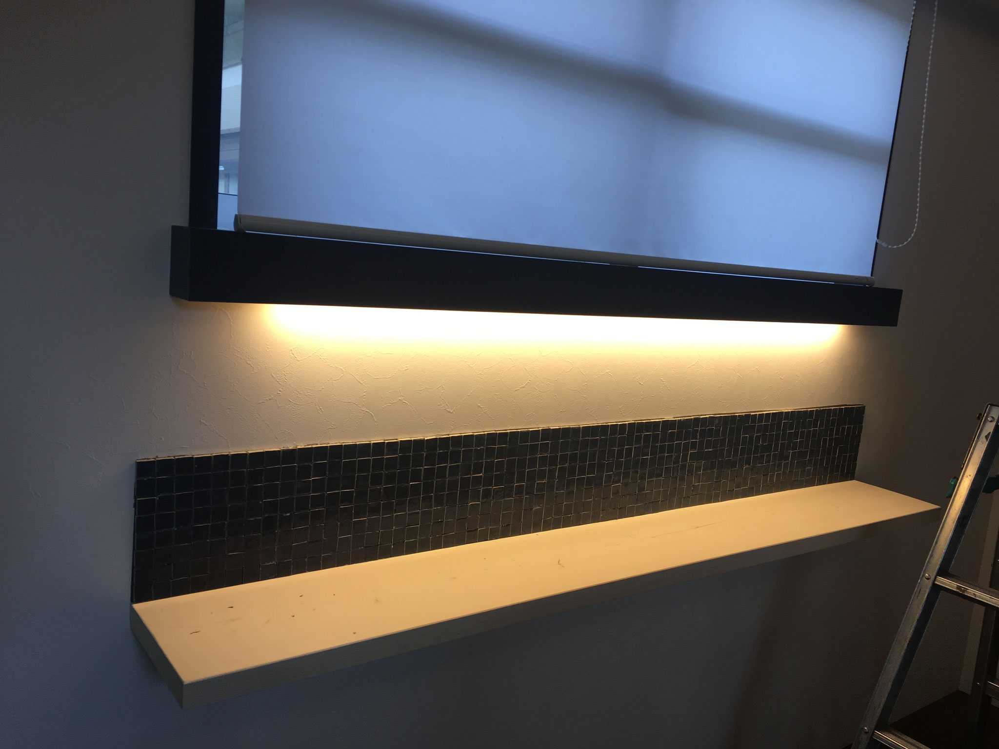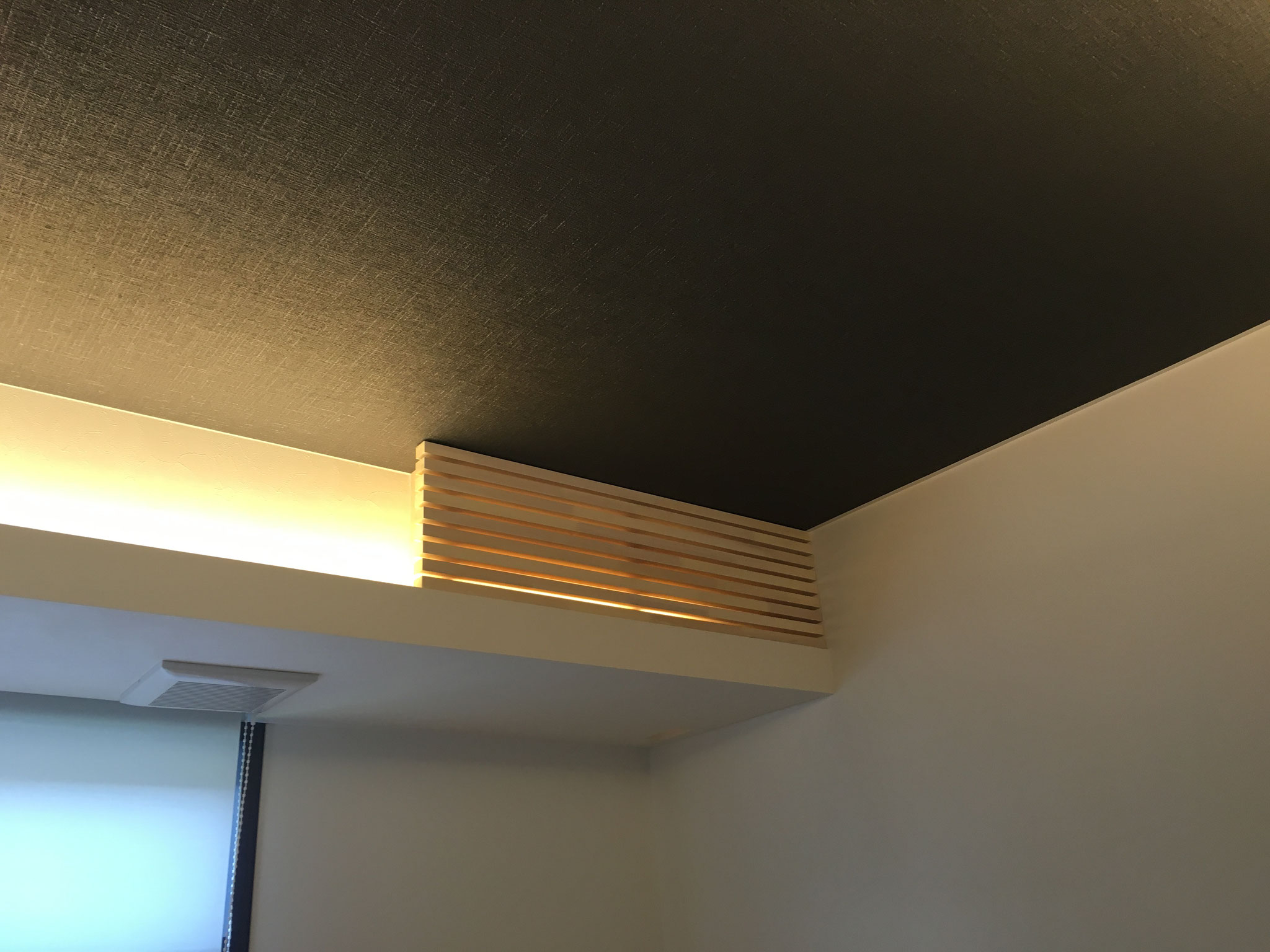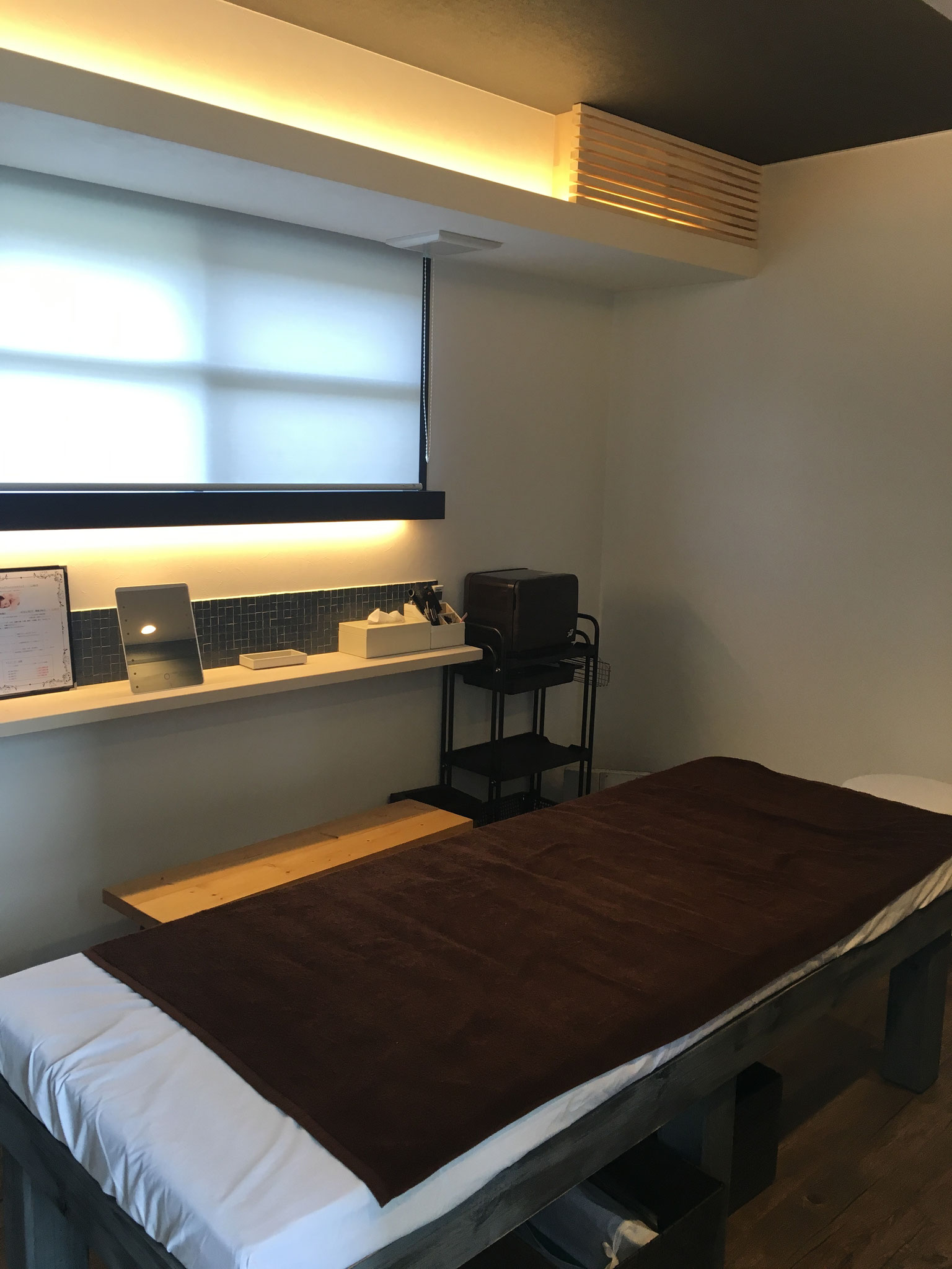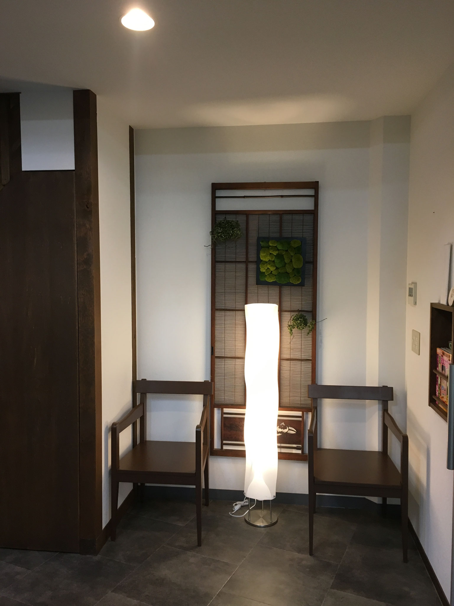 株式会社 YUIKEN 様より会議室6帖+収納をエステ空間にリノベーションの提案依頼をいただきました。施工は大工さんでもあるYUIKEN社長自らやっていました。間接照明でやわらかい雰囲気に。一面の壁を木を貼りグレーに塗装、ネイビーのモザイクタイルでアクセント。飾りた棚に商品をディスプレイできます。エステ後お化粧直しカウンターや備品の収納も提案させていただきました。