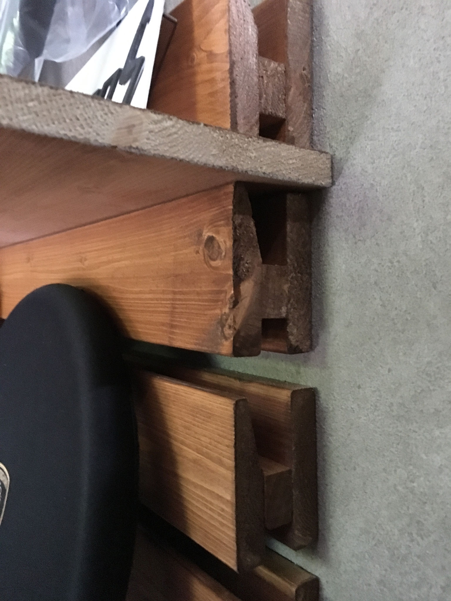 木の丸太を敷き詰めた壁は、インパクトもあるが温かみがあります。壁にはワインを飾れます。